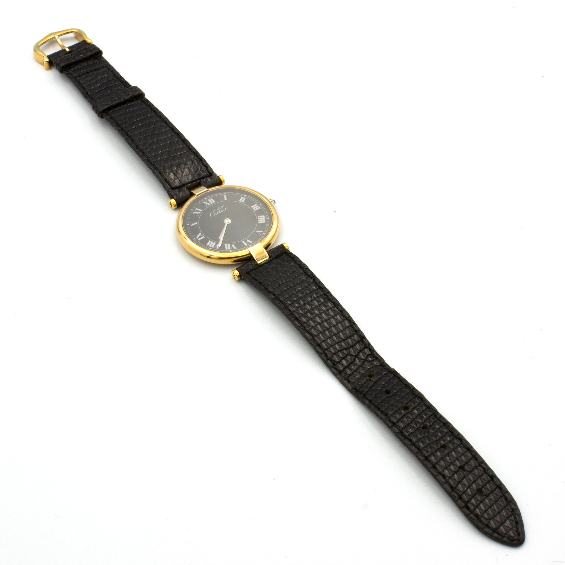 - Black lizard strap signed Cartier, gold-plated buckle signed Cartier.