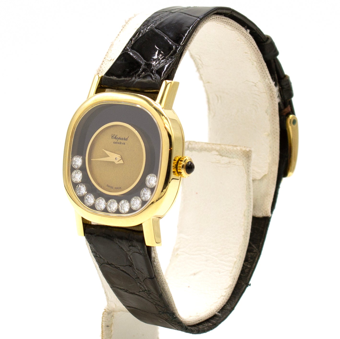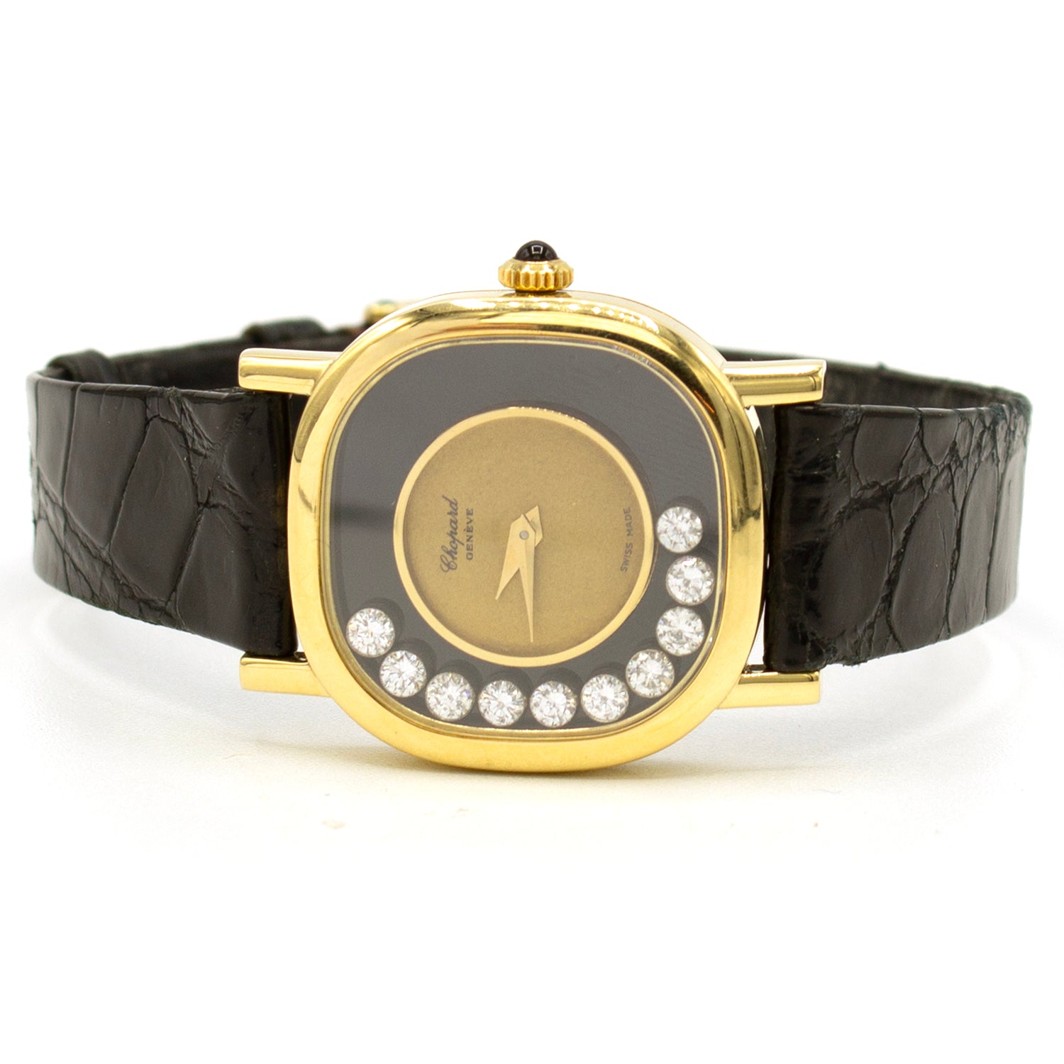 - Boitier en or jaune 18 carats, cadran doré et noir retenant 10 superbes diamants mobiles.