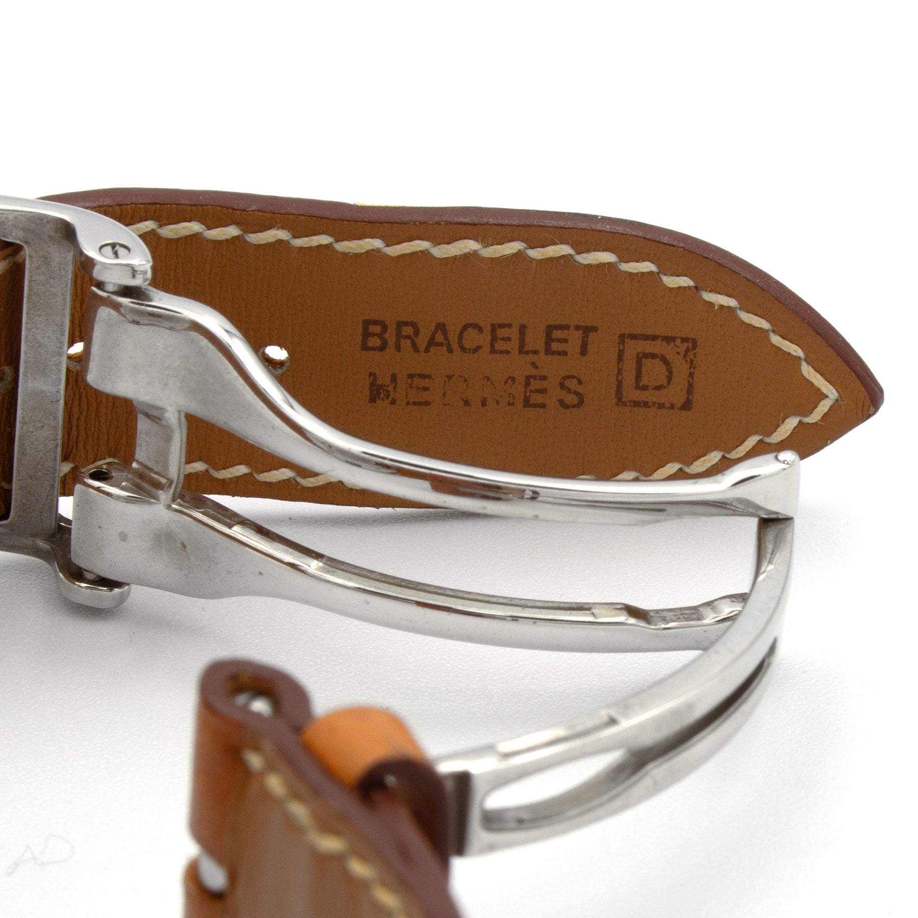 - Bracelet en cuir de veau barenia signé Hermès, boucle déployante signée Hermès en acier.
