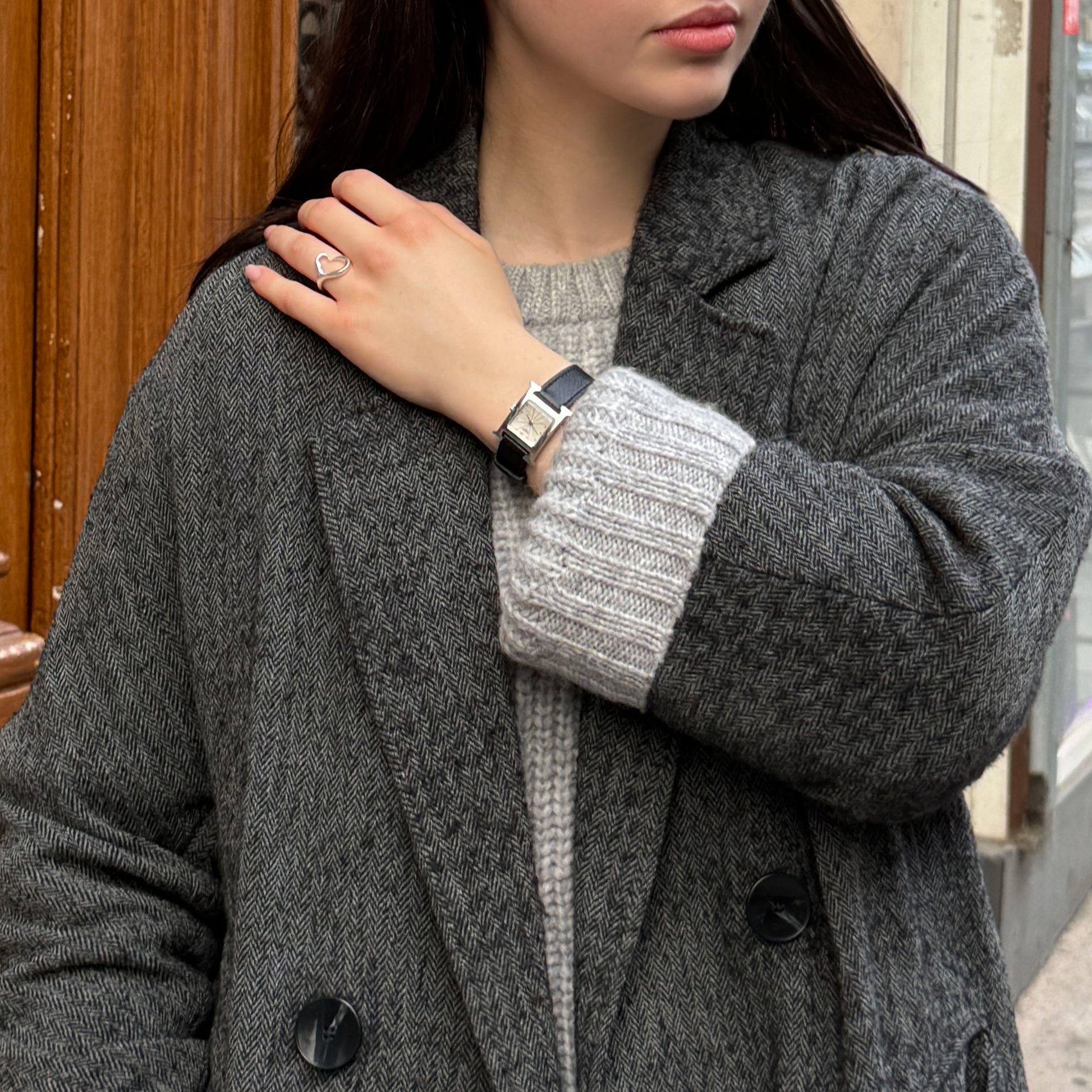 - Boitier en acier de forme H, fond vissé, couronne cannelée.