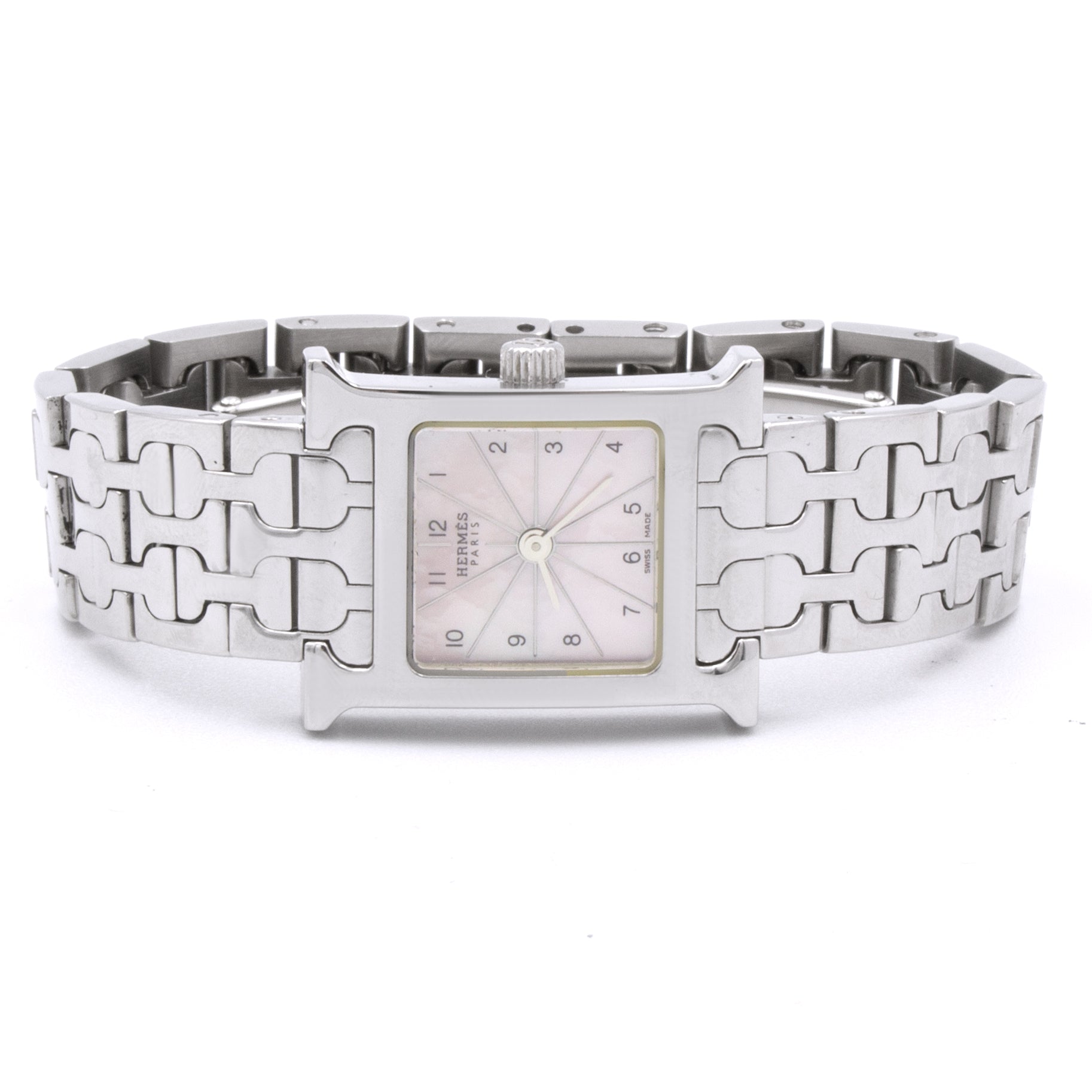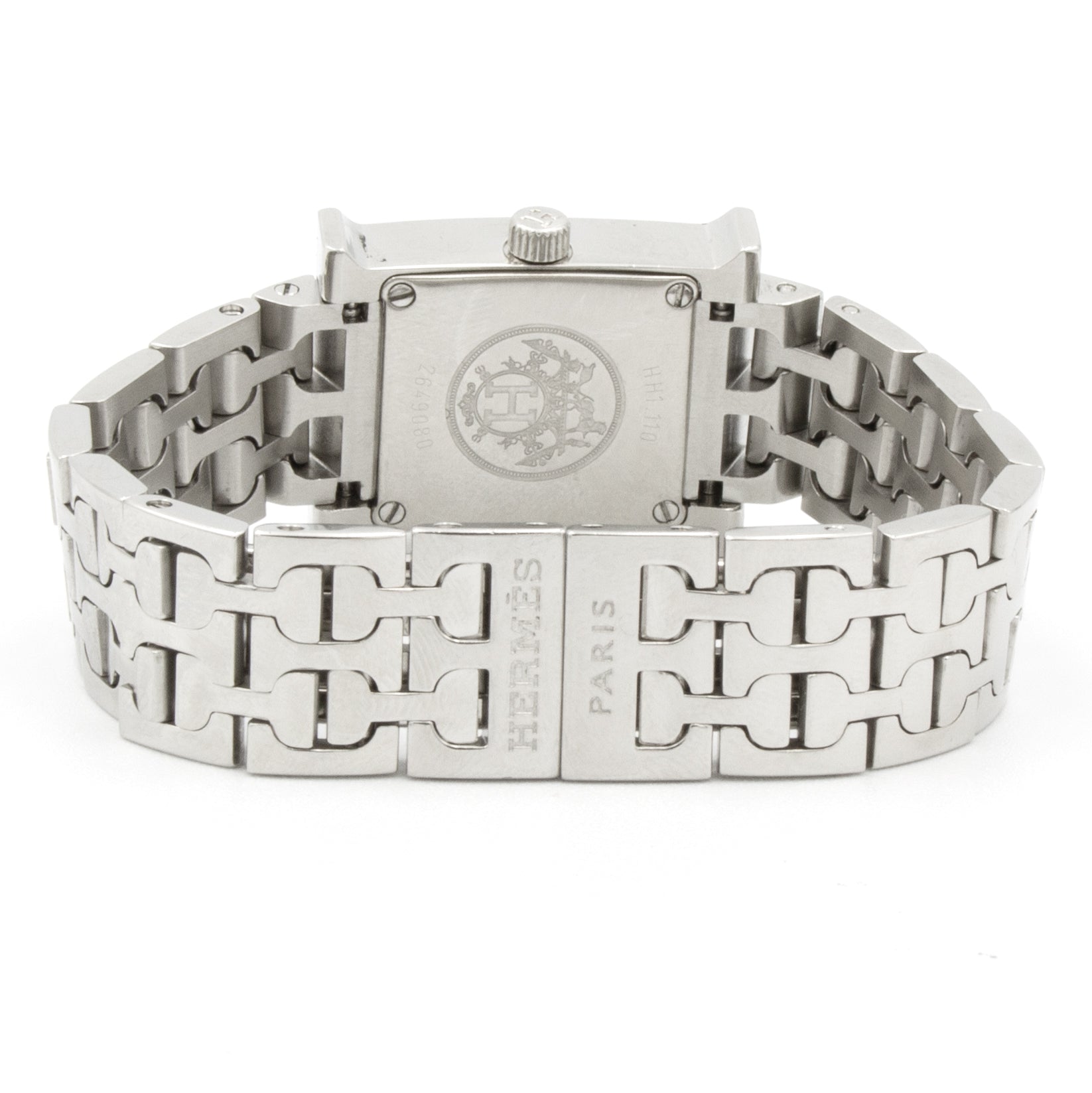 - Boitier en acier de forme H, fond vissé, couronne cannelée.