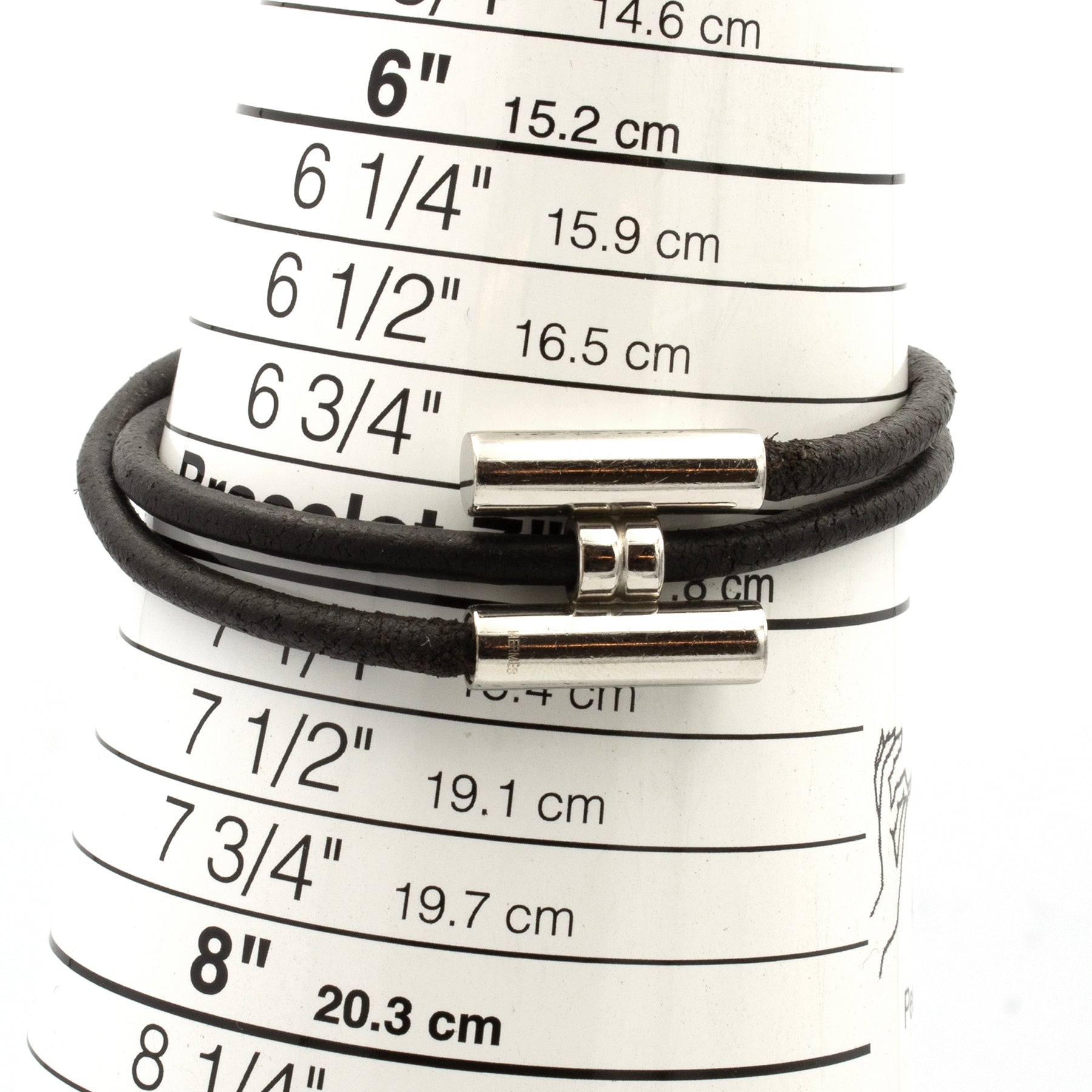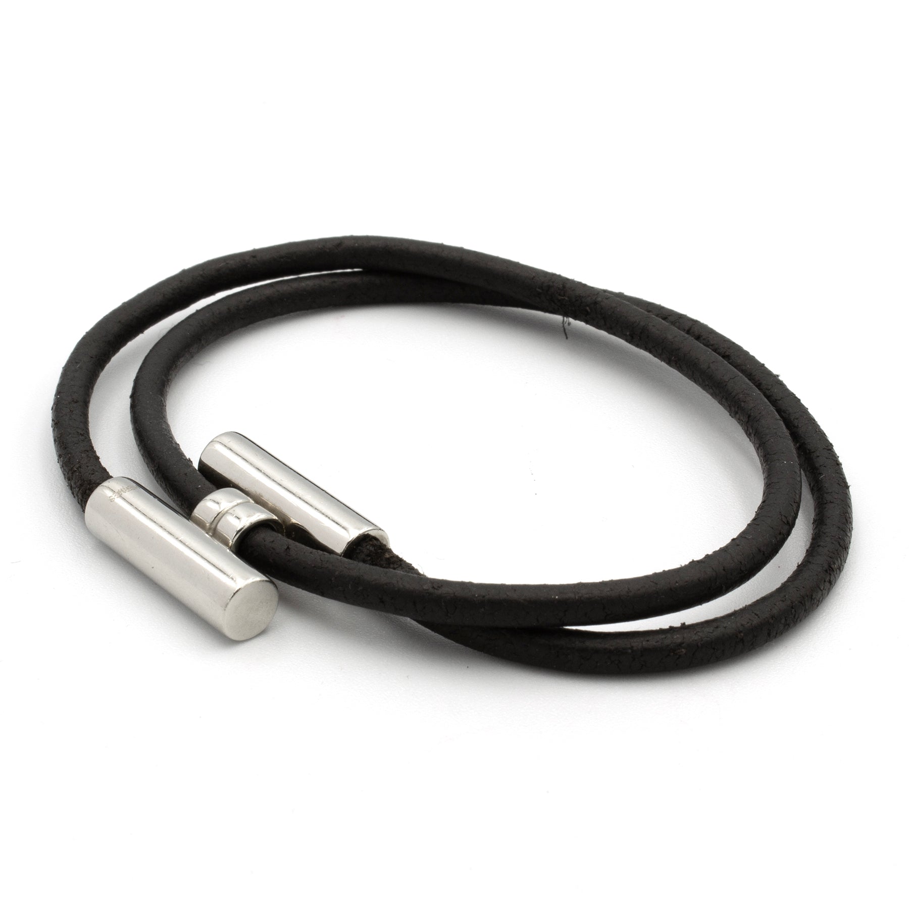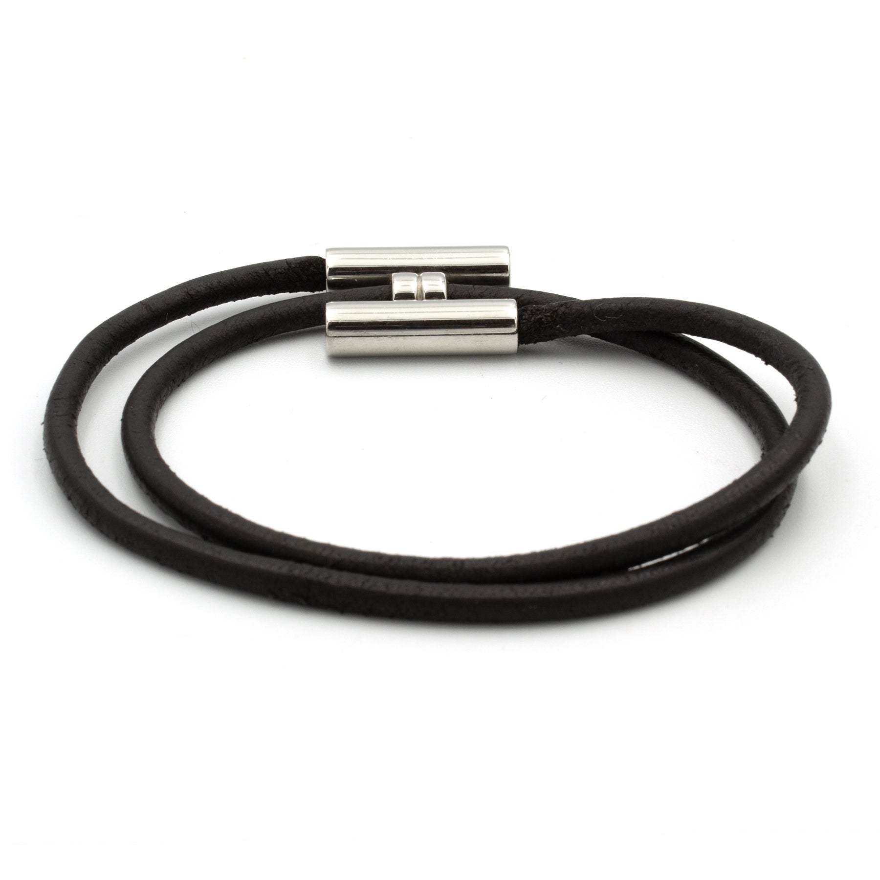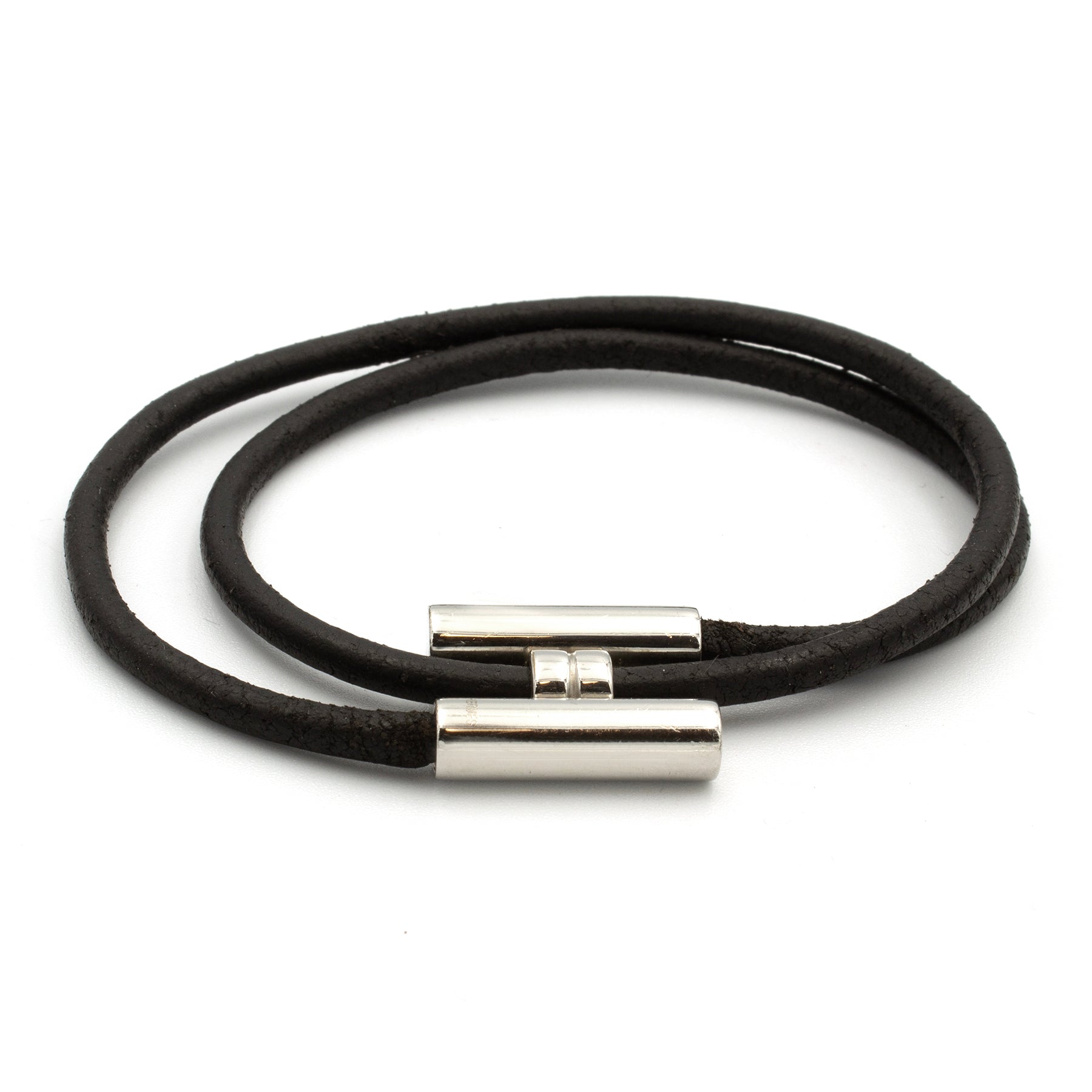 Beautiful Hermès Tournis Bracelet. Composed of a double turn link in black leather and a jewel H in silver plated metal. Adjustable wrist. Dimensions: maximum wrist size of 18cm. Some slight traces of wear (please refer to photos). Signed.