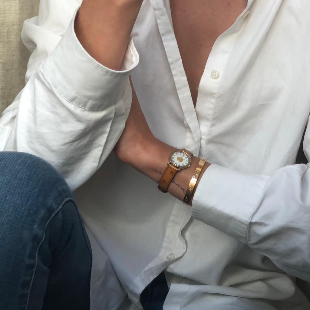 - Cadran blanc à chiffres arabes peints, aiguilles lances, macaron de la marque Hermès plaqué or appliqué au centre.