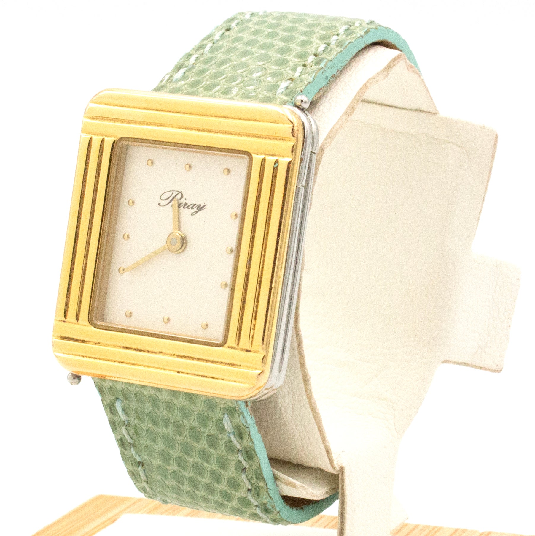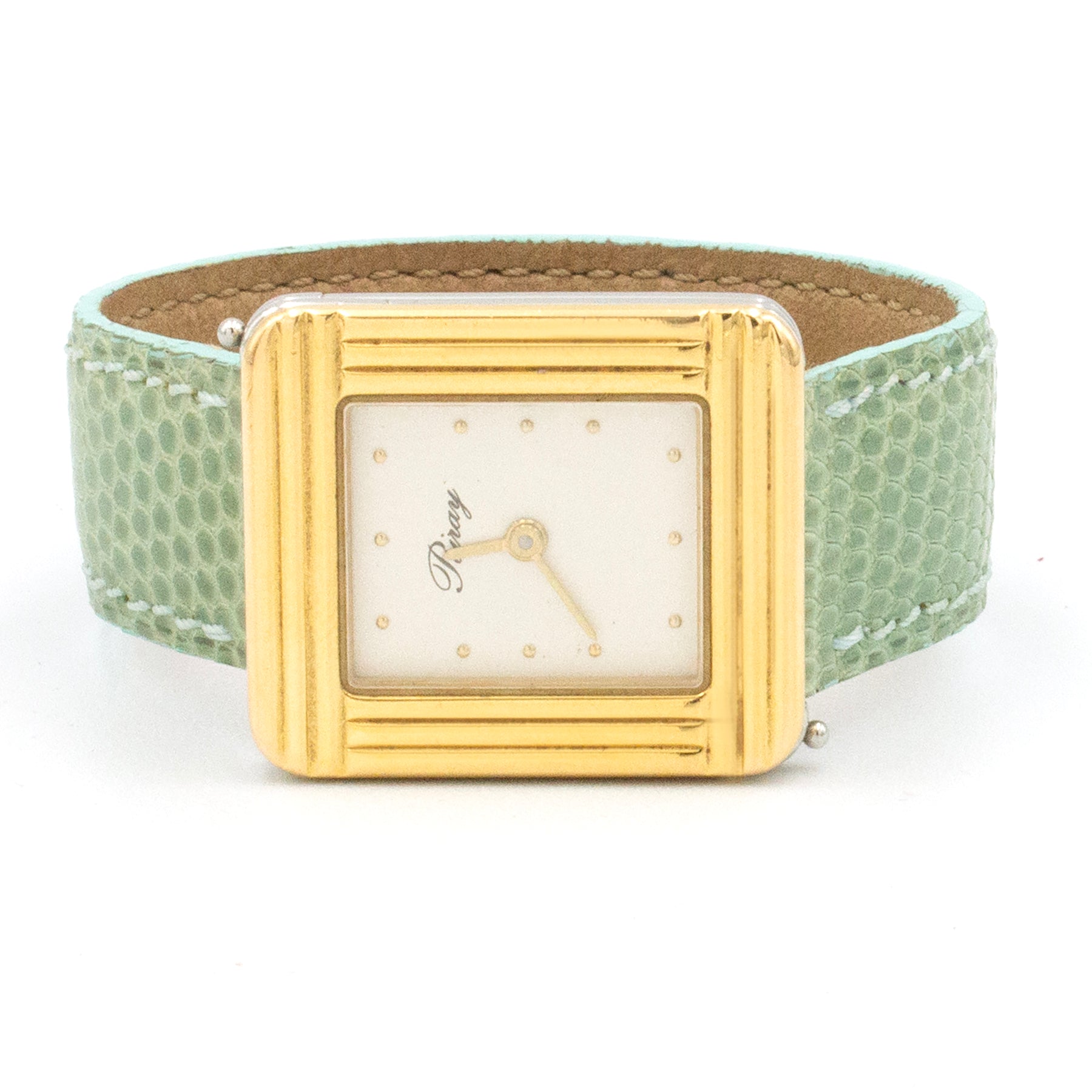 - The Poiray strap is made of green lizard leather.