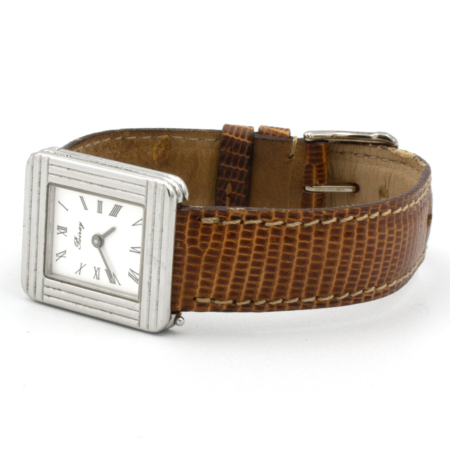 Magnifique montre Ma Première de la maison Poiray. Boîtier rectangulaire en acier, à angles arrondis, à décor de godrons. Cadran blanc, chiffres romains et aiguilles en acier. Mouvement à quartz. Dimensions boitier : 26 x 22 mm. La montre a été entièrement révisée dans notre atelier et sera livrée avec un an de garantie vendeur à compter de la date d'achat. Le bracelet est en cuir de lézard. Traces d'usure normales sur le bracelet pour un objet d'occasion. Bon état du boitier. Voir photos pour les détails. Le système horloger unique d'ouverture à cliquets permet de changer son bracelet en un tour de main. Cadran, boîtier & mouvement signés/numérotés.