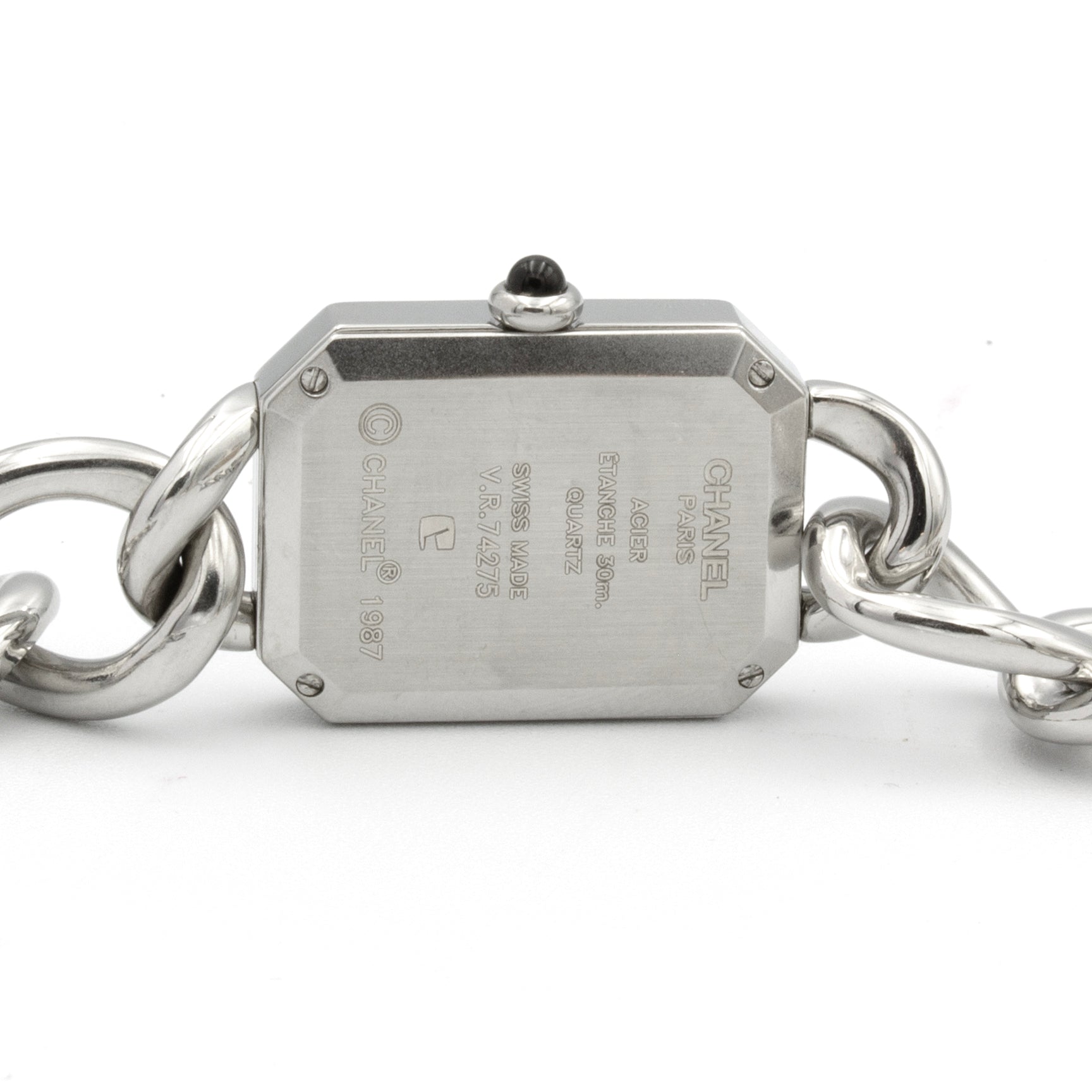 - Cadran laqué noir, inscription Chanel et Swiss en lettres blanches.