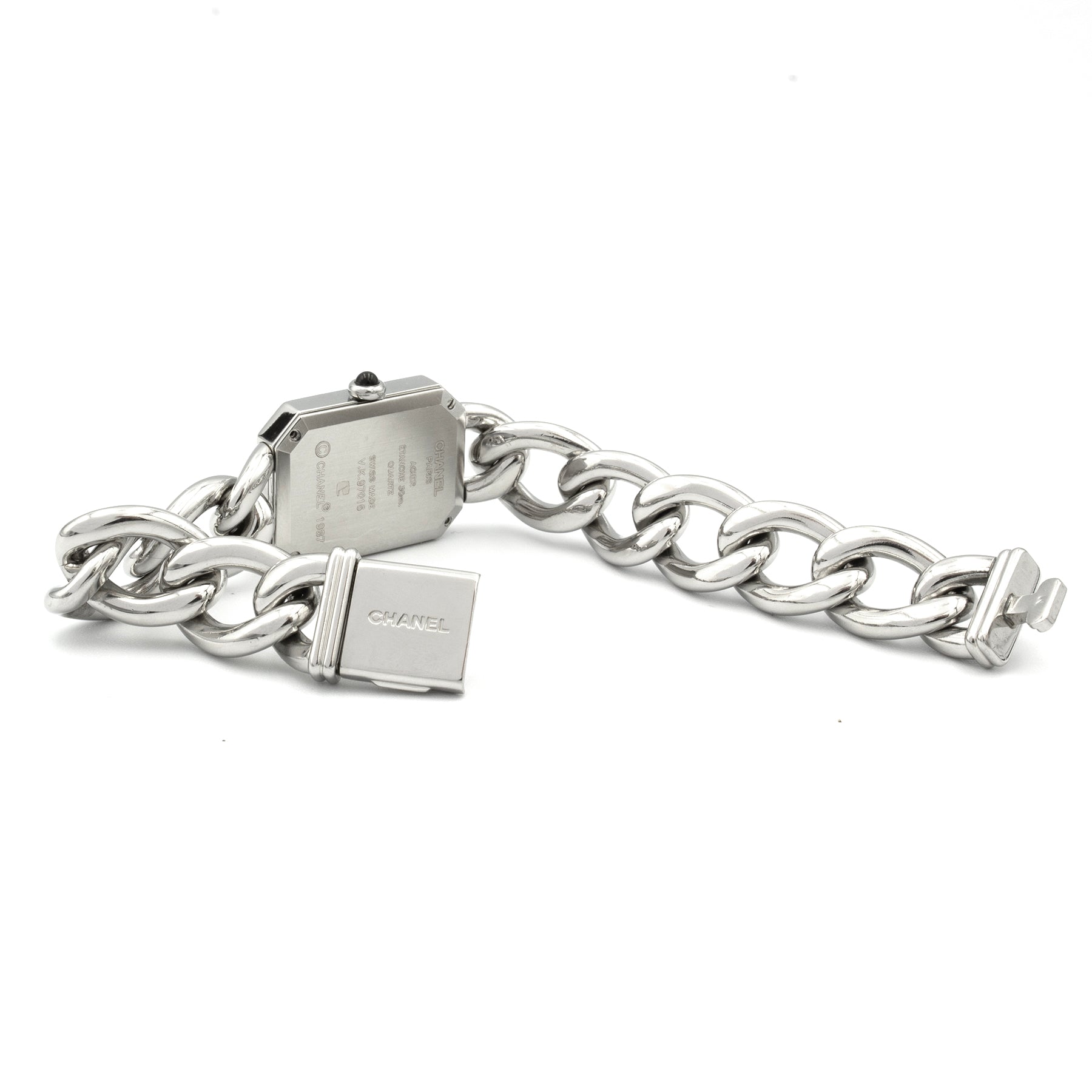 - Cadran laqué noir, inscription Chanel et Swiss en lettres blanches.