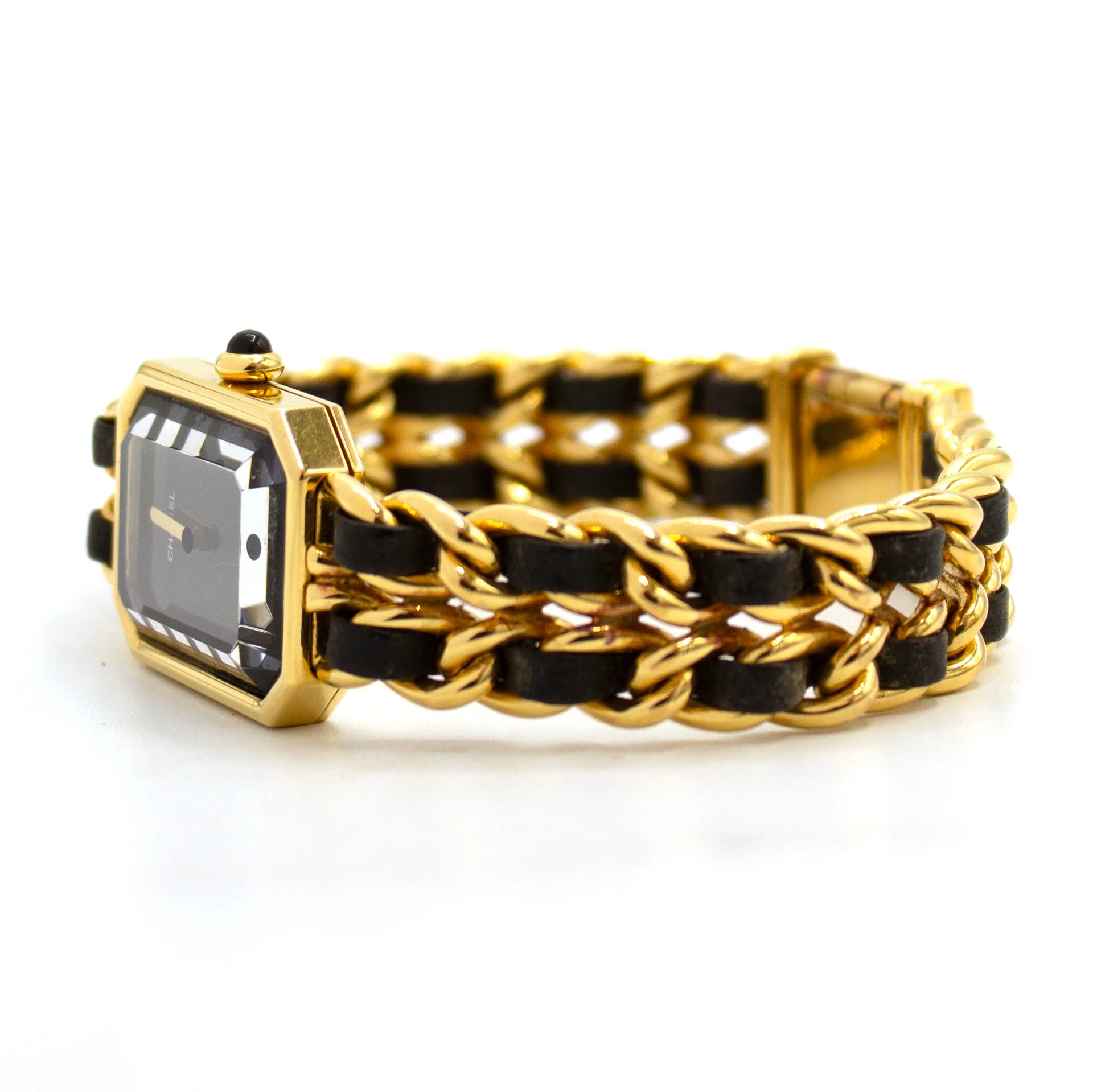 - Gold-plated steel link bracelet interlaced with a black leather ribbon.