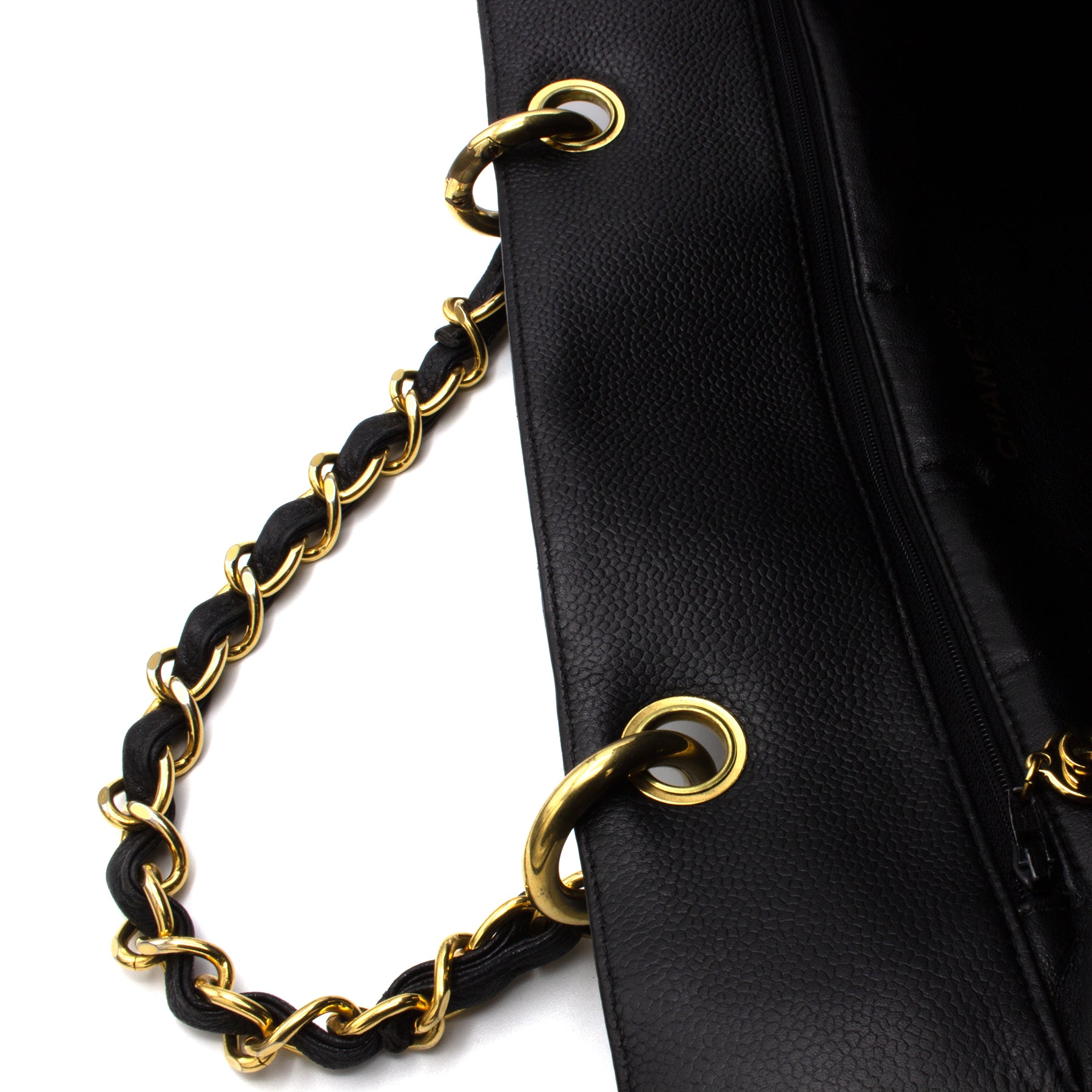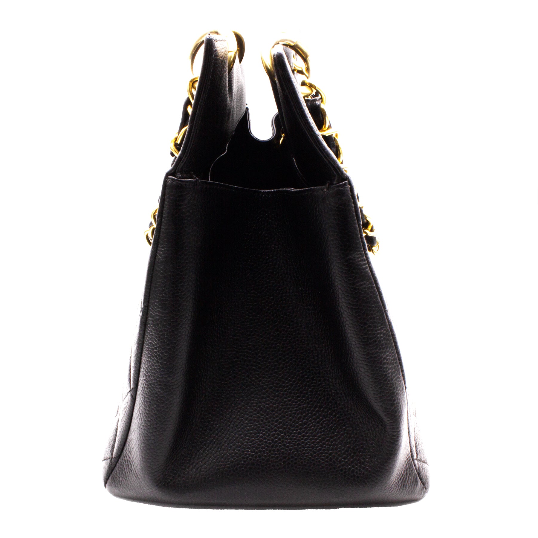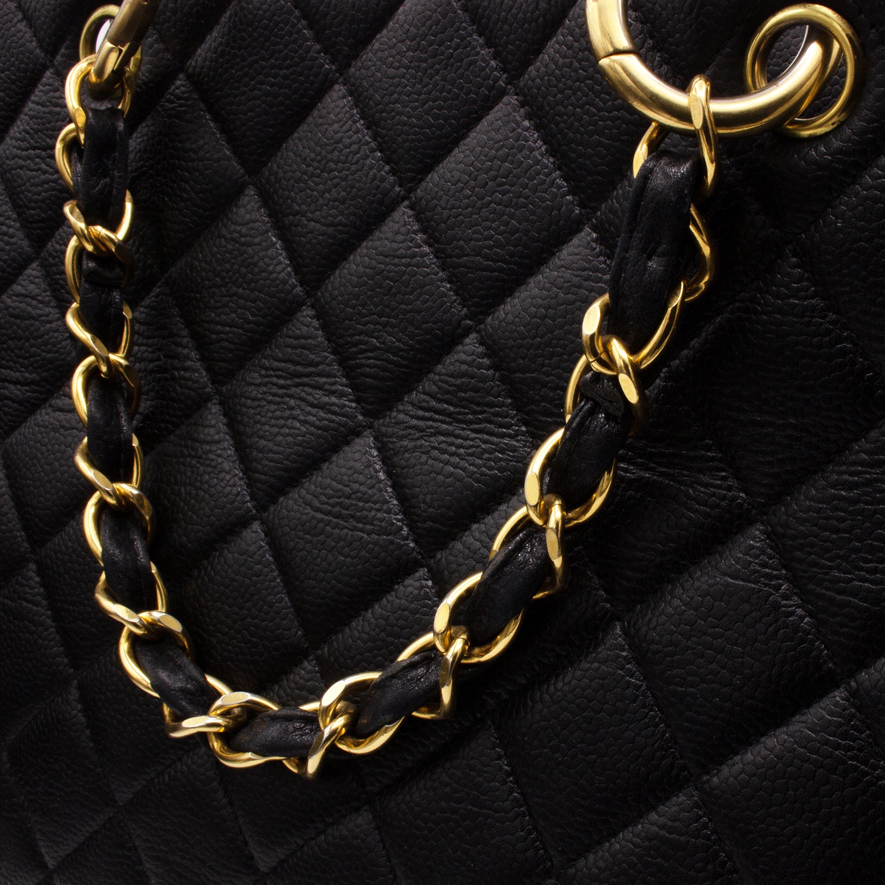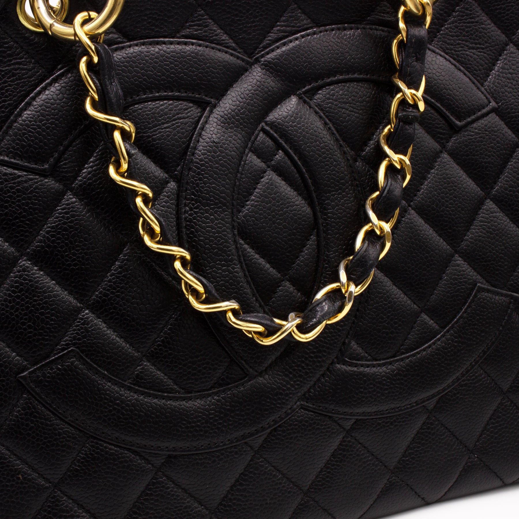 Classique sac cabas Chanel Shopping GST en cuir caviar grainé matelassé noir, garniture en métal doré, double anse-chaine en métal doré entrelacée de cuir noir.