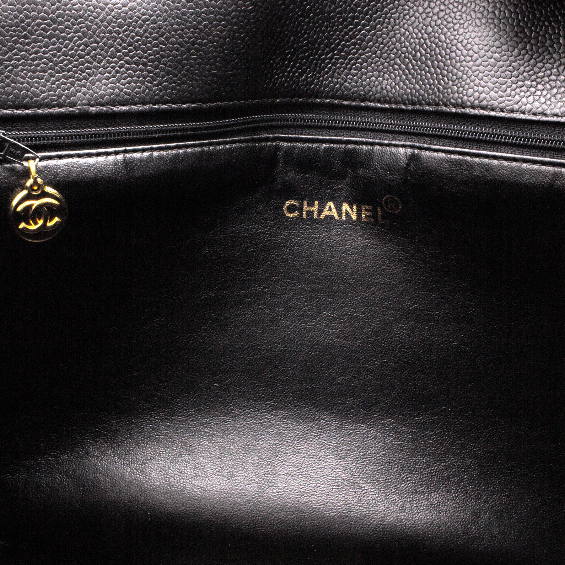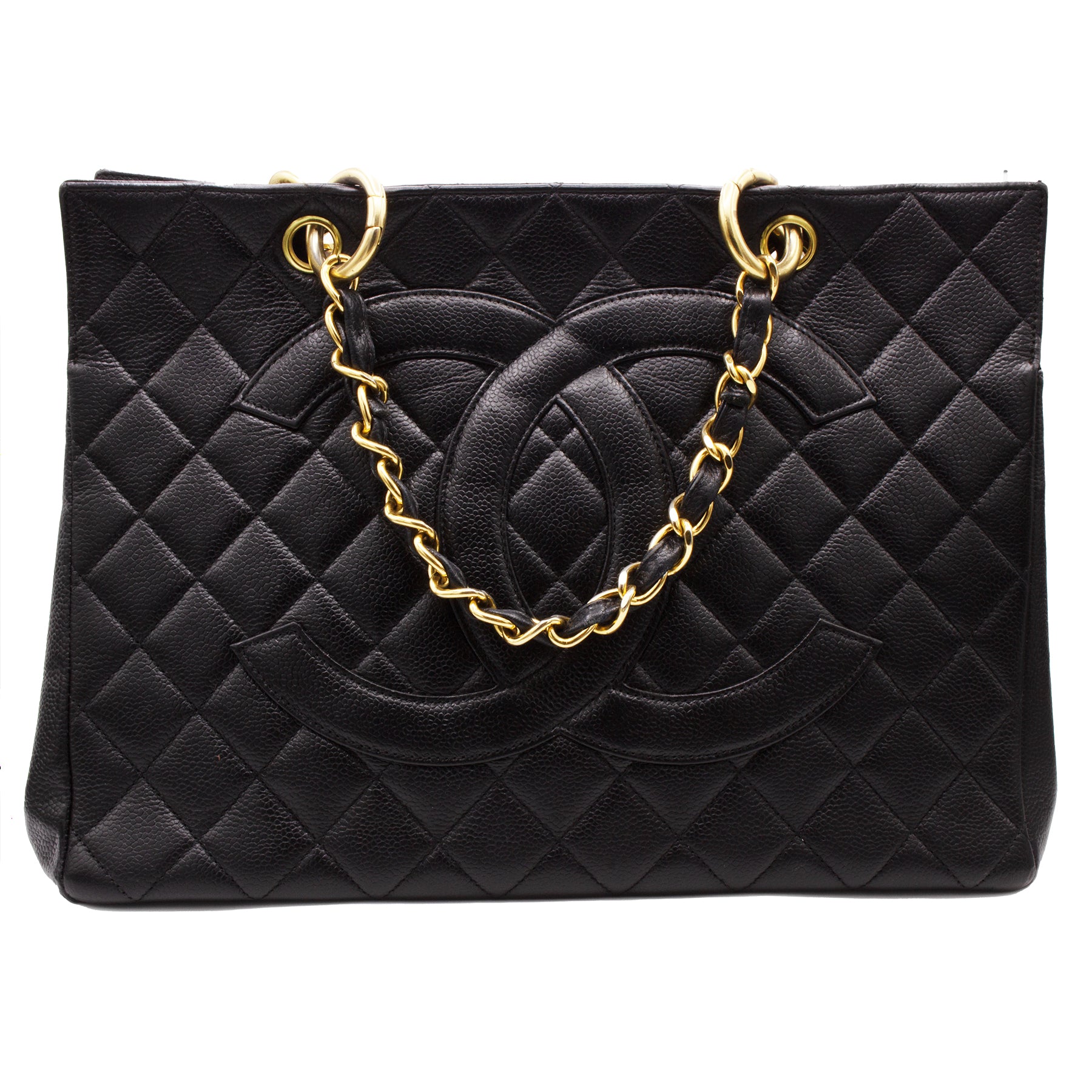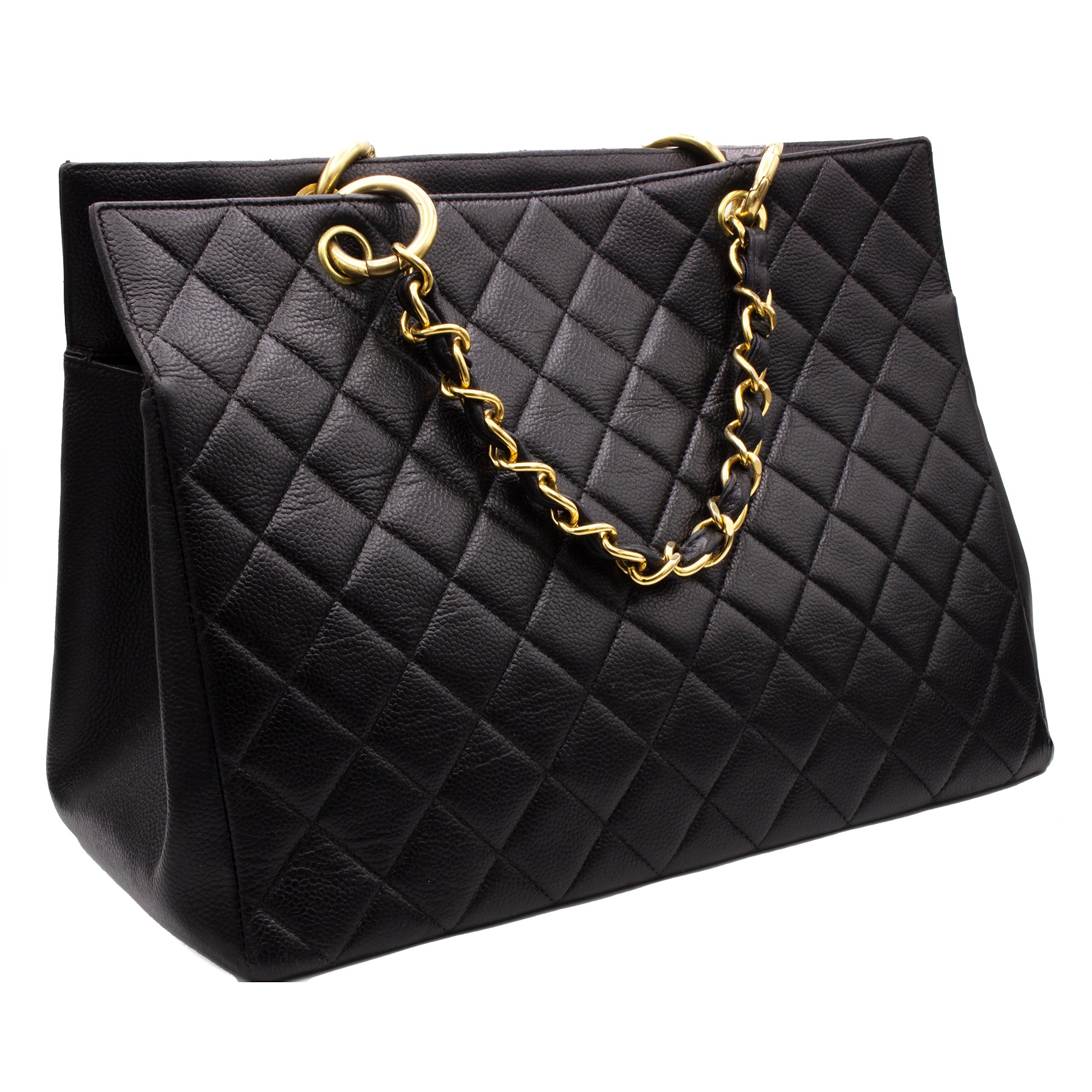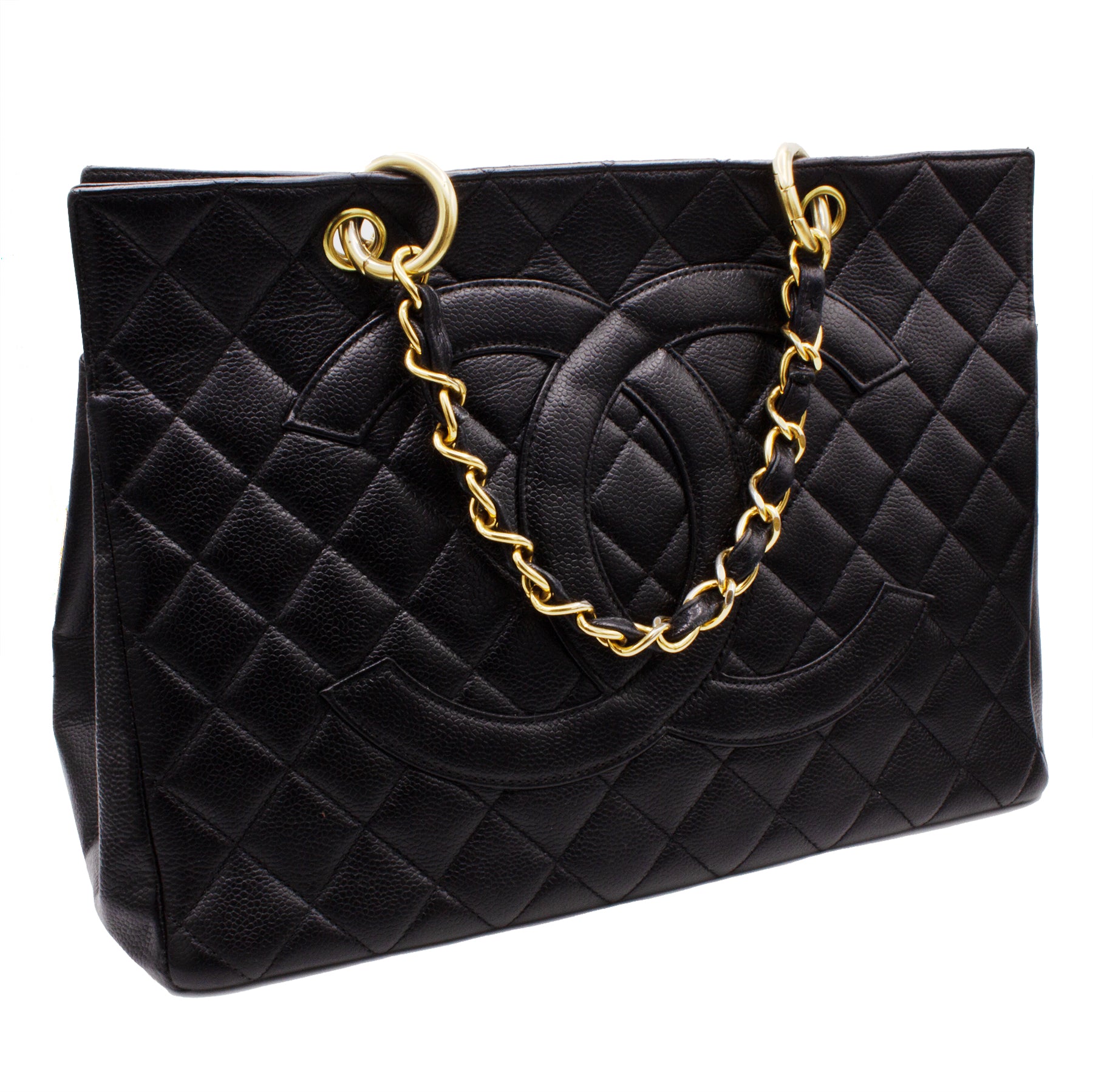 Classique sac cabas Chanel Shopping GST en cuir caviar grainé matelassé noir, garniture en métal doré, double anse-chaine en métal doré entrelacée de cuir noir.