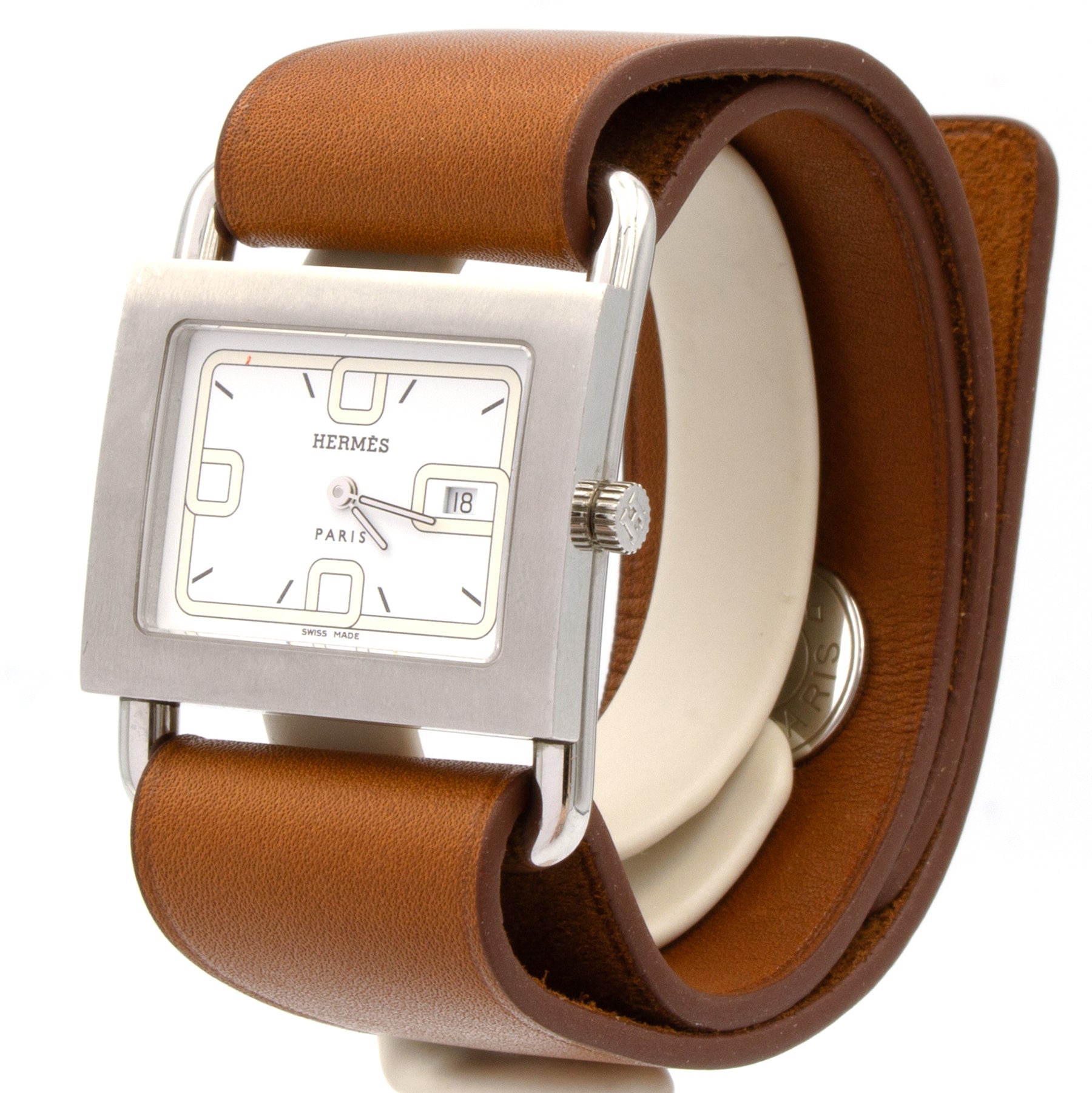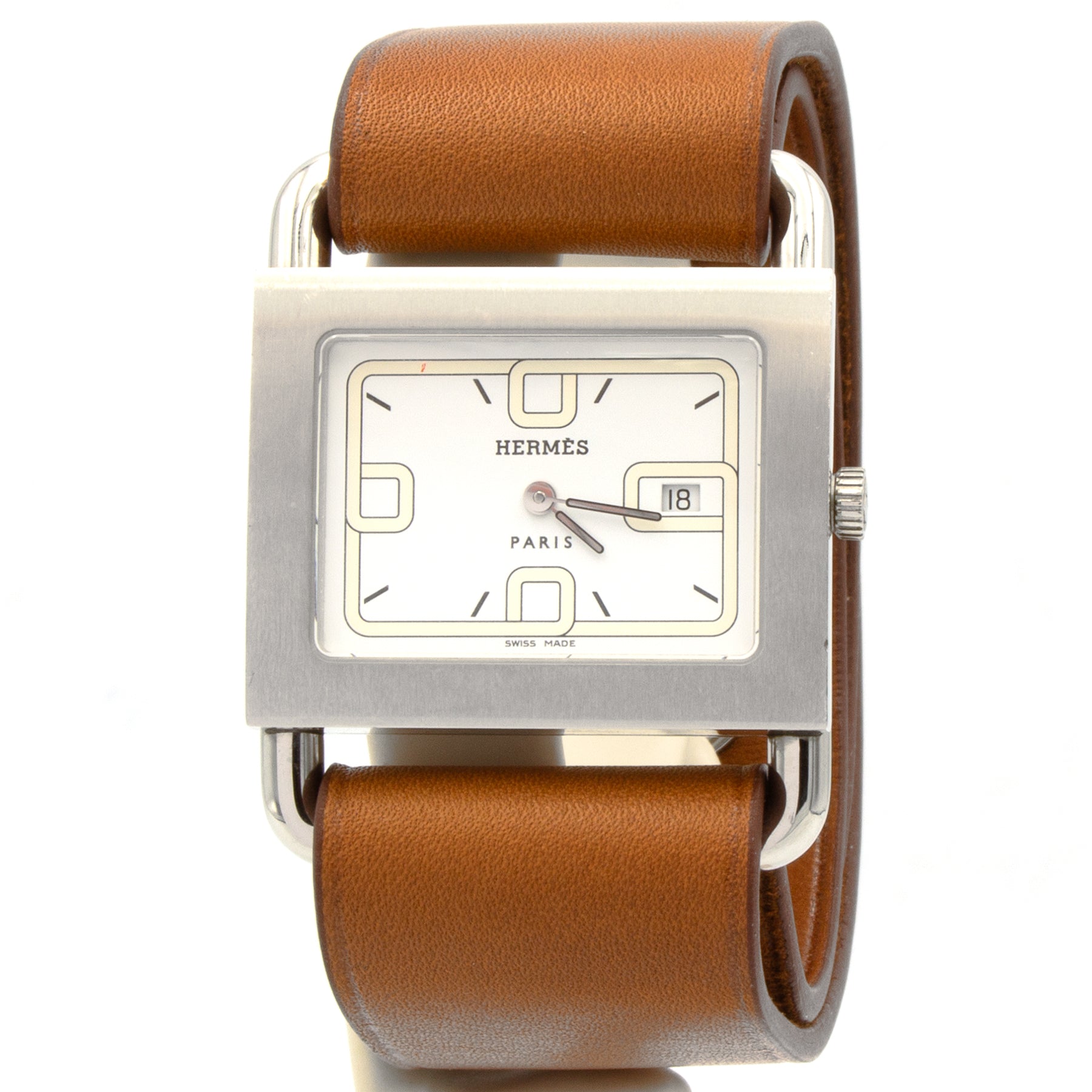 - Natural barenia calf leather strap signed Hermès, adjustable with 5 holes. Leather strap width 24mm.