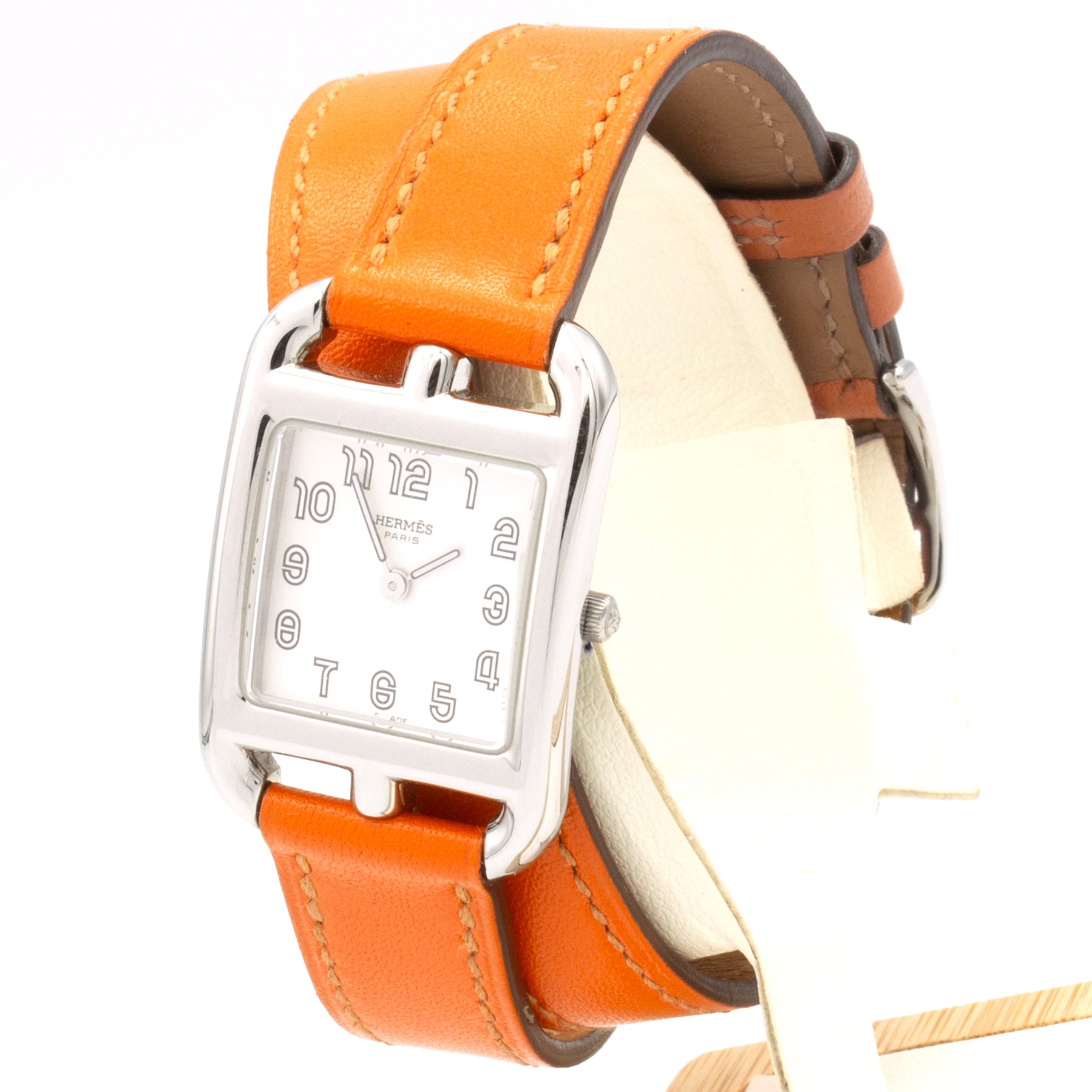 - Double-wrap orange leather strap by Hermès, steel buckle.