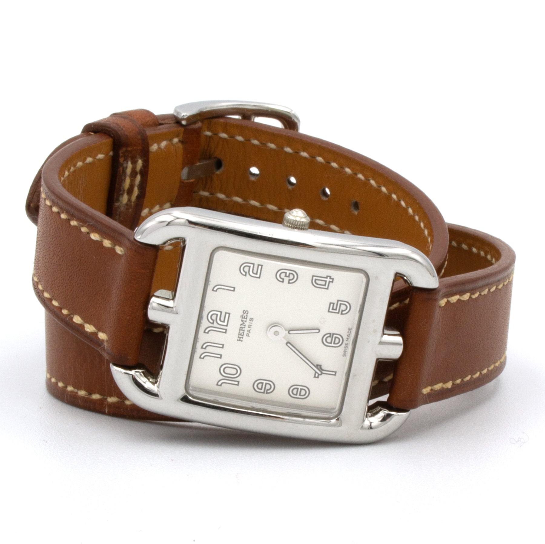 - Double-wrap calfskin leather strap by Hermès, steel buckle.