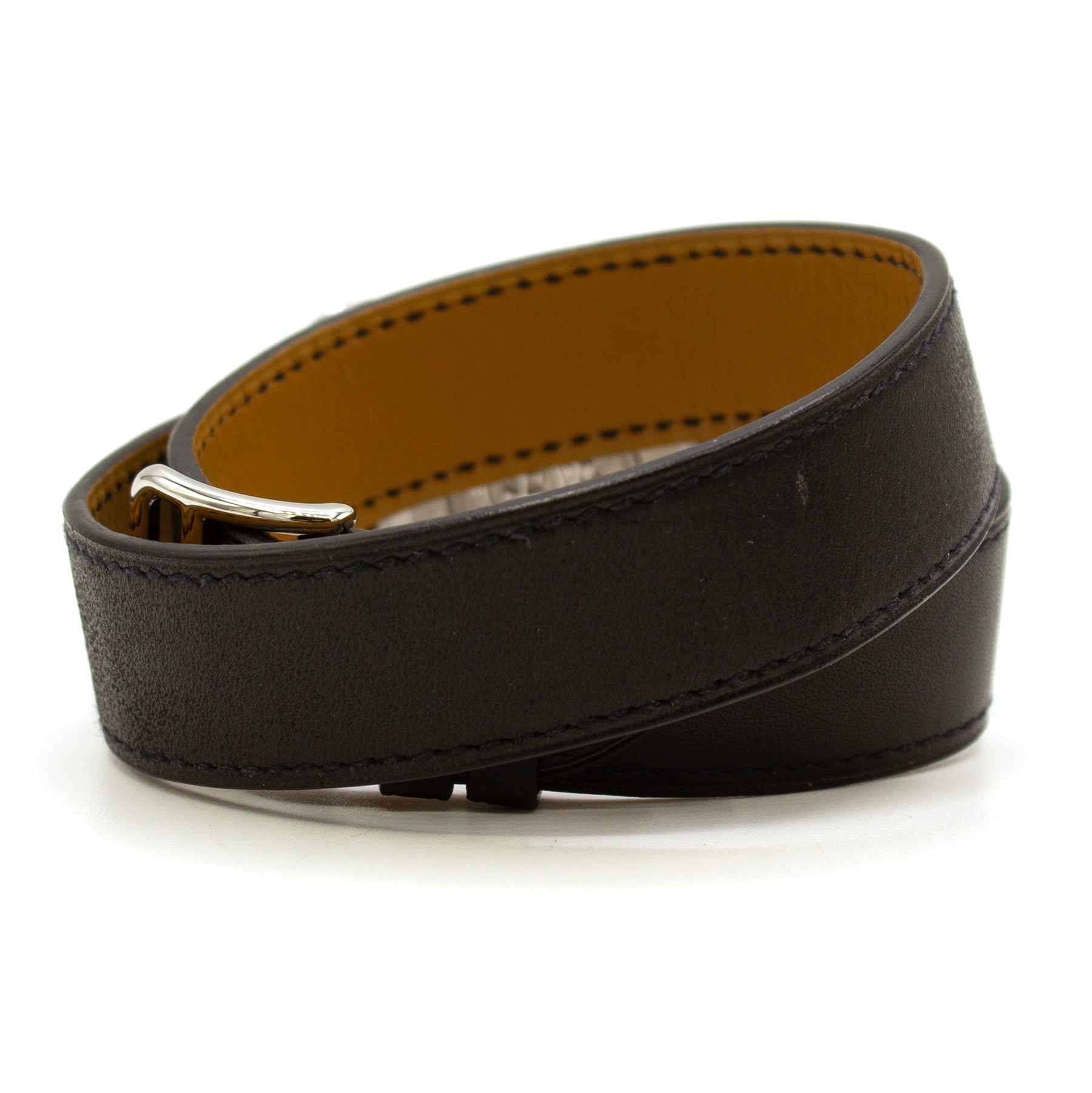 - Bracelet double tour en cuir noir signé Hermès, boucle ardillon signée.