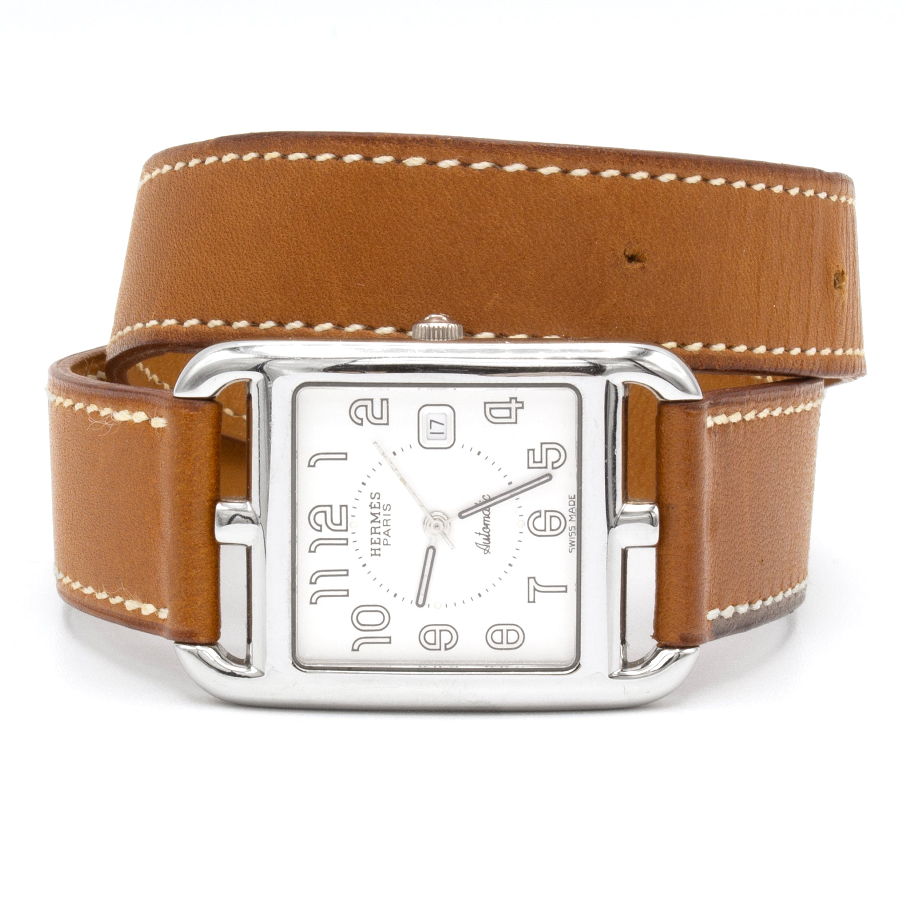 - Double-wrap calfskin leather strap by Hermès, steel pin buckle, signed.