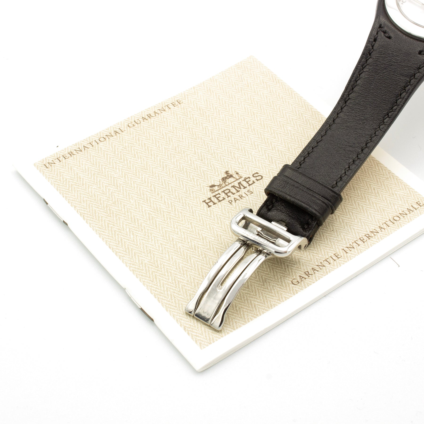 - Black leather strap signed Hermès, steel folding clasp signed Hermès.