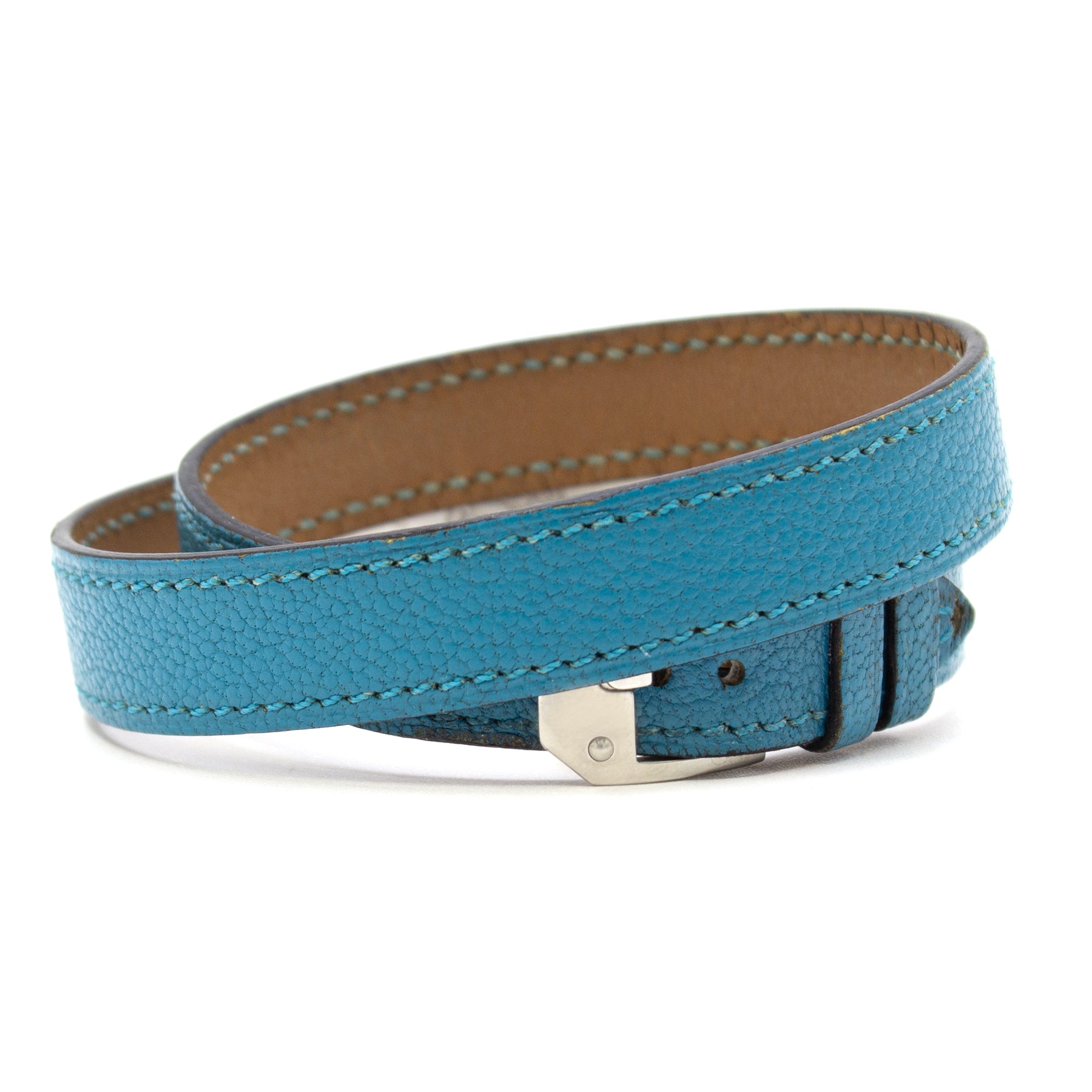 - Bracelet double tour en cuir bleu à boucle ardillon, réglable aux six trous. Boucle et bracelet signés Hermès.