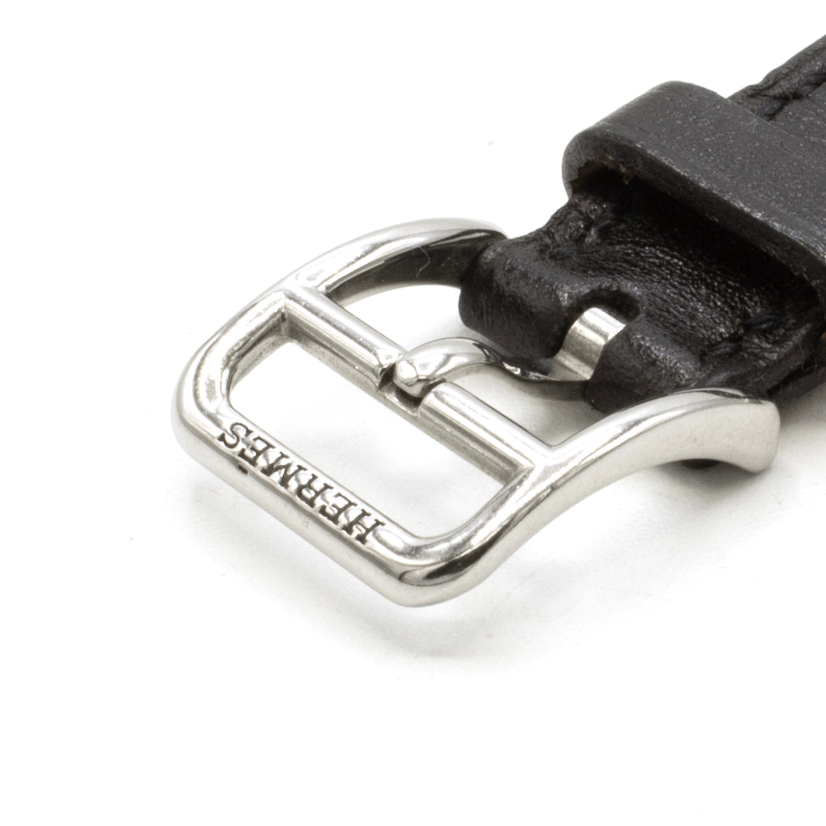 - Smooth black leather strap signed Hermès. Signed steel pin buckle.