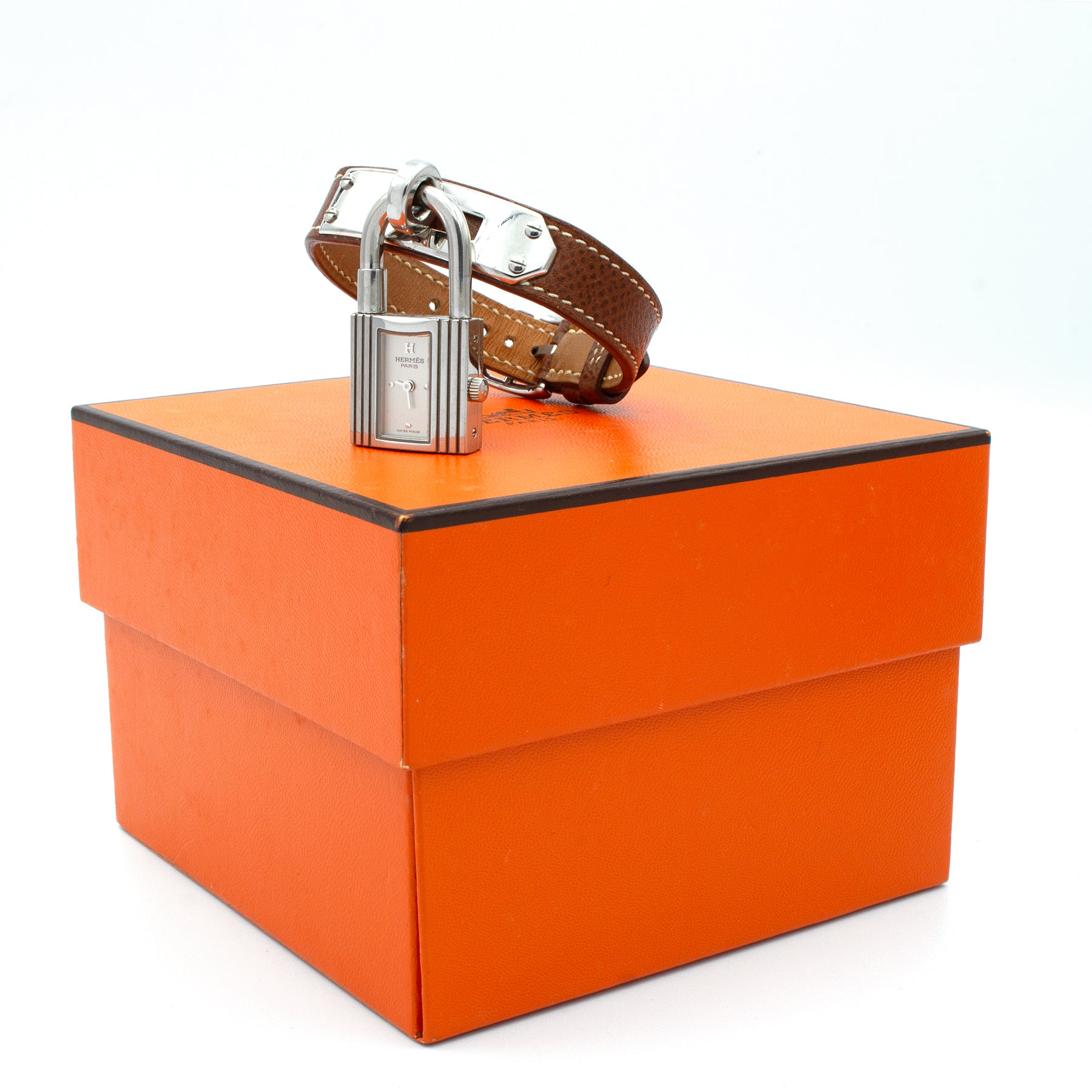 Beautiful Hermès Kelly KE1.210 watch. Natural Epsom gold leather strap signed Hermès. Signed steel pin buckle. Fits wrists from 14 to 19 cm. Mobile padlock. Steel case 20mm x 20mm. Silver dial. Watch keeps accurate time. Case in very good condition, bracelet in good condition with normal signs of wear (see photos for details). Comes with a one-year seller's warranty from date of purchase. Dial, case & movement signed/numbered.