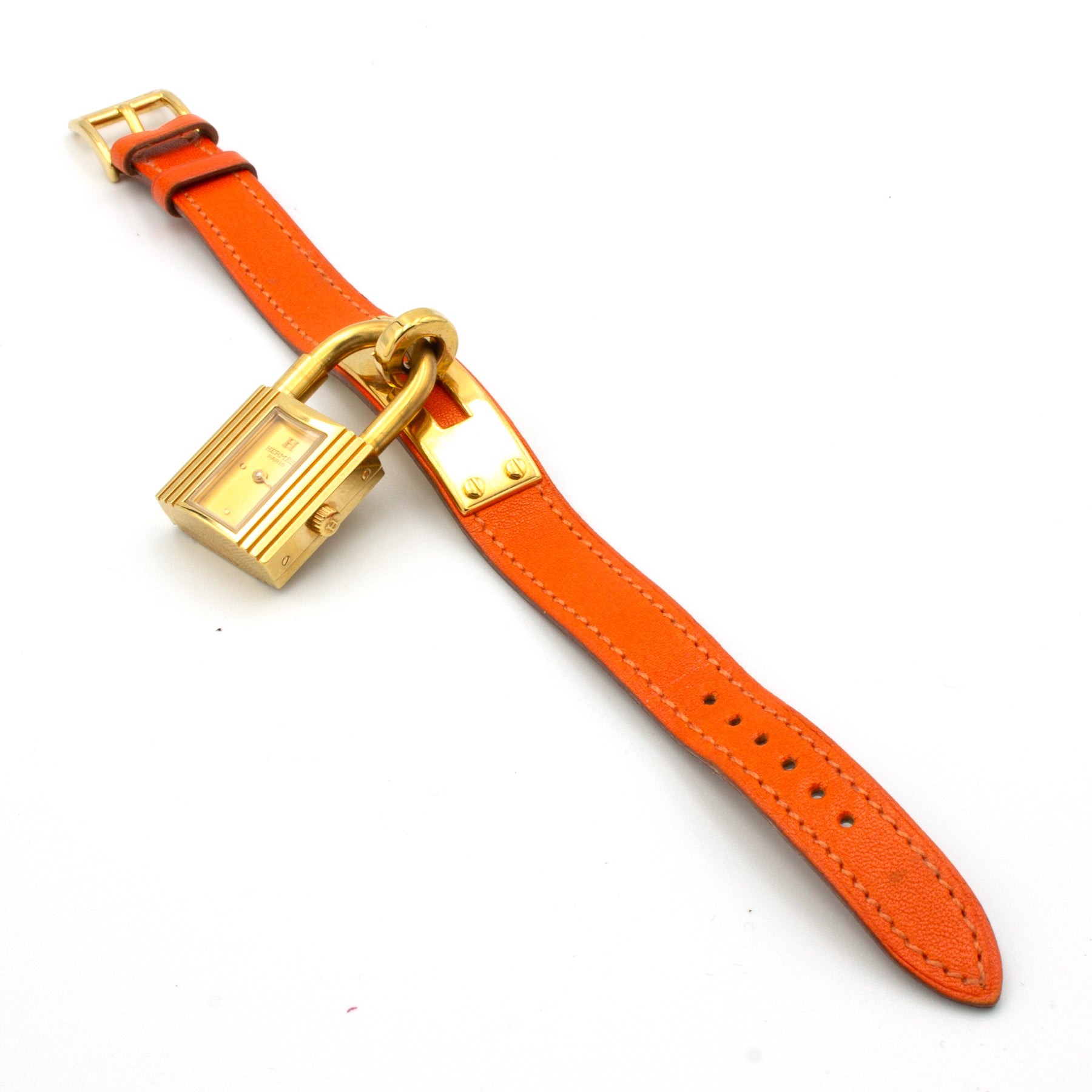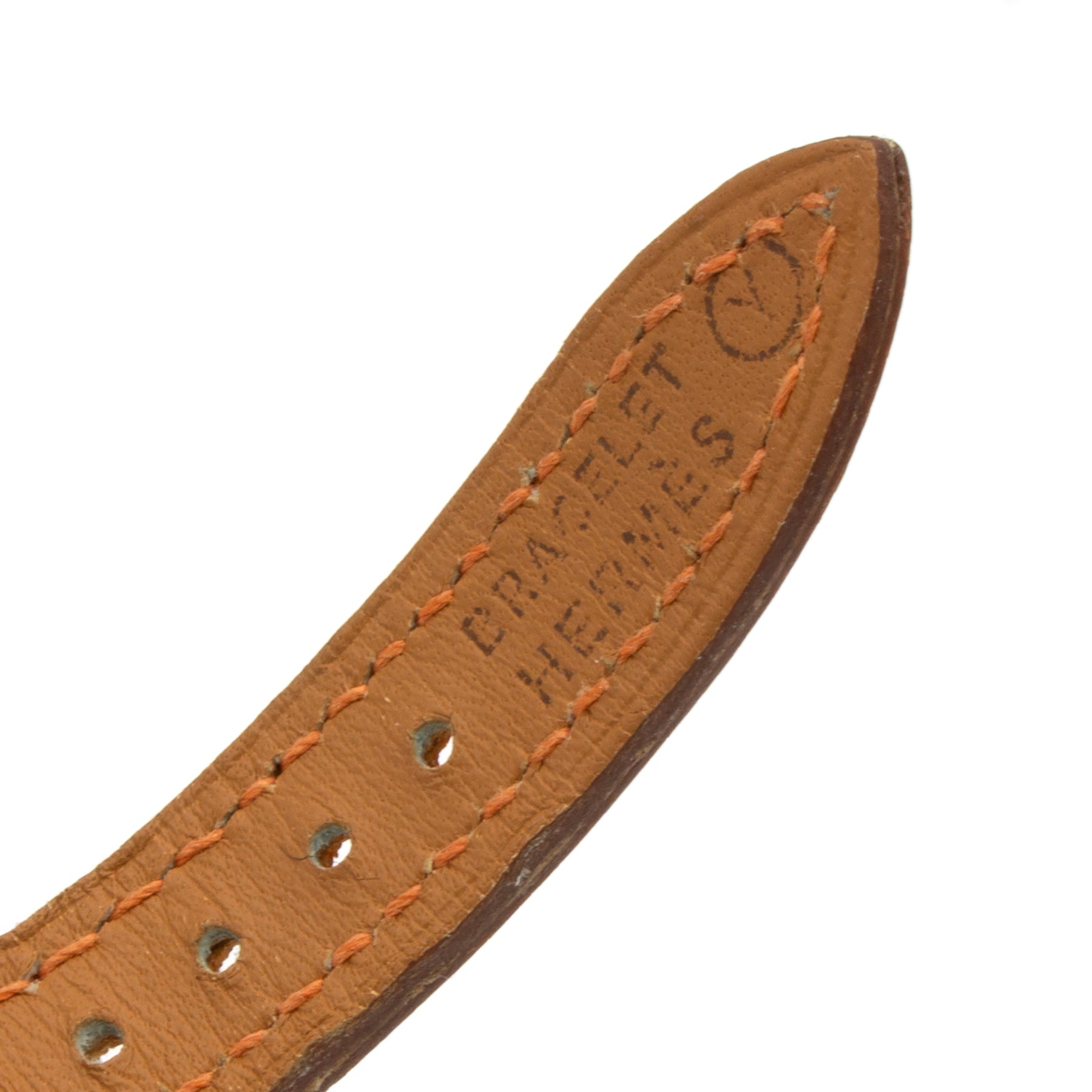 - Single-wrap orange leather strap signed Hermès, original gold pin buckle.