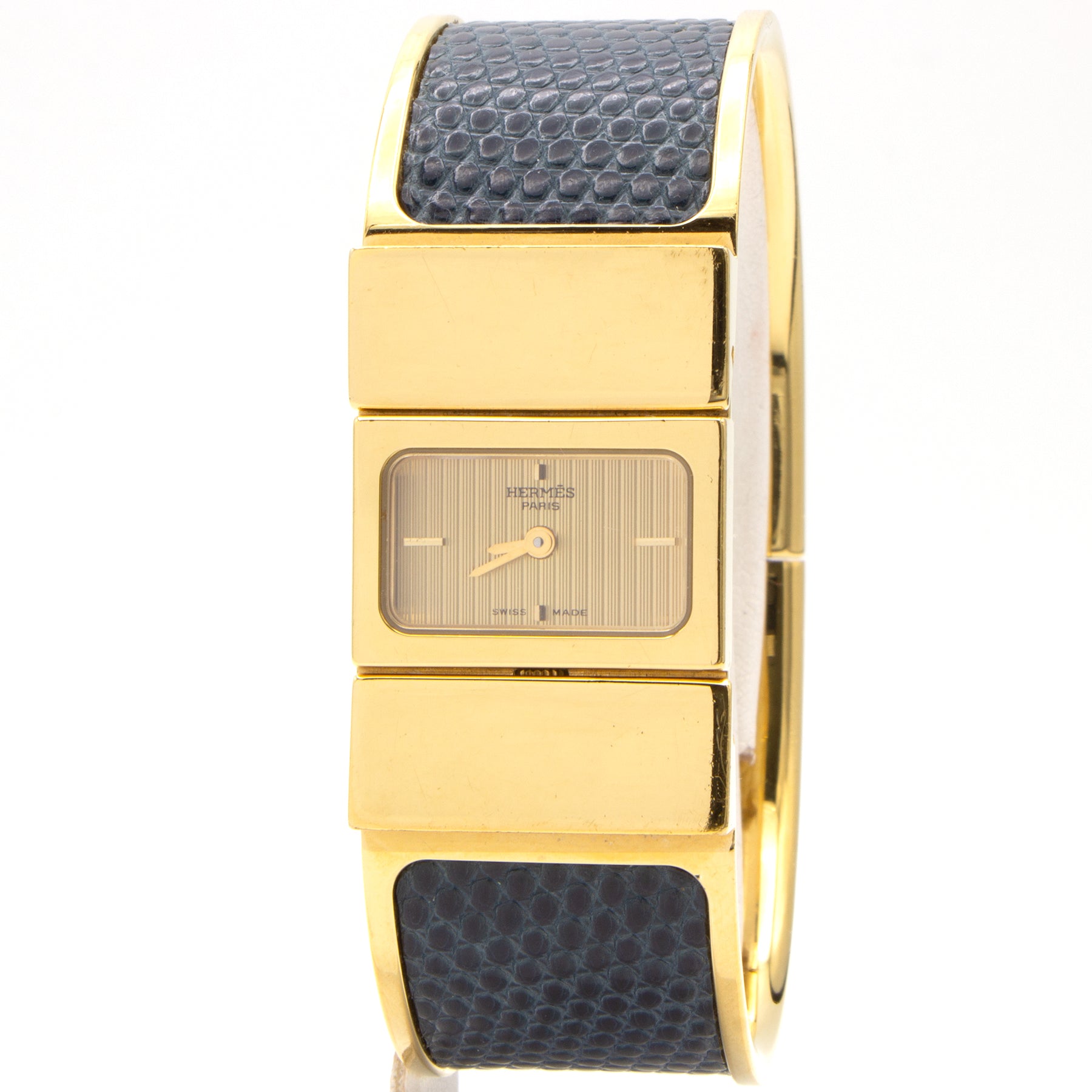 Beautiful Hermès Loquet watch, model LO1.210 for women. Directly inspired by the clic-clac bracelet, the case is housed within the clasp mechanism. Gold-plated Hermès bracelet covered in blue lizard leather. 13 x 19 mm steel case. Gold dial. Quartz movement - Swiss-made. The watch has been fully serviced in our workshop and comes with a one-year seller's warranty from the date of purchase. In good overall condition, with normal signs of wear for a second-hand item. Signed and numbered.