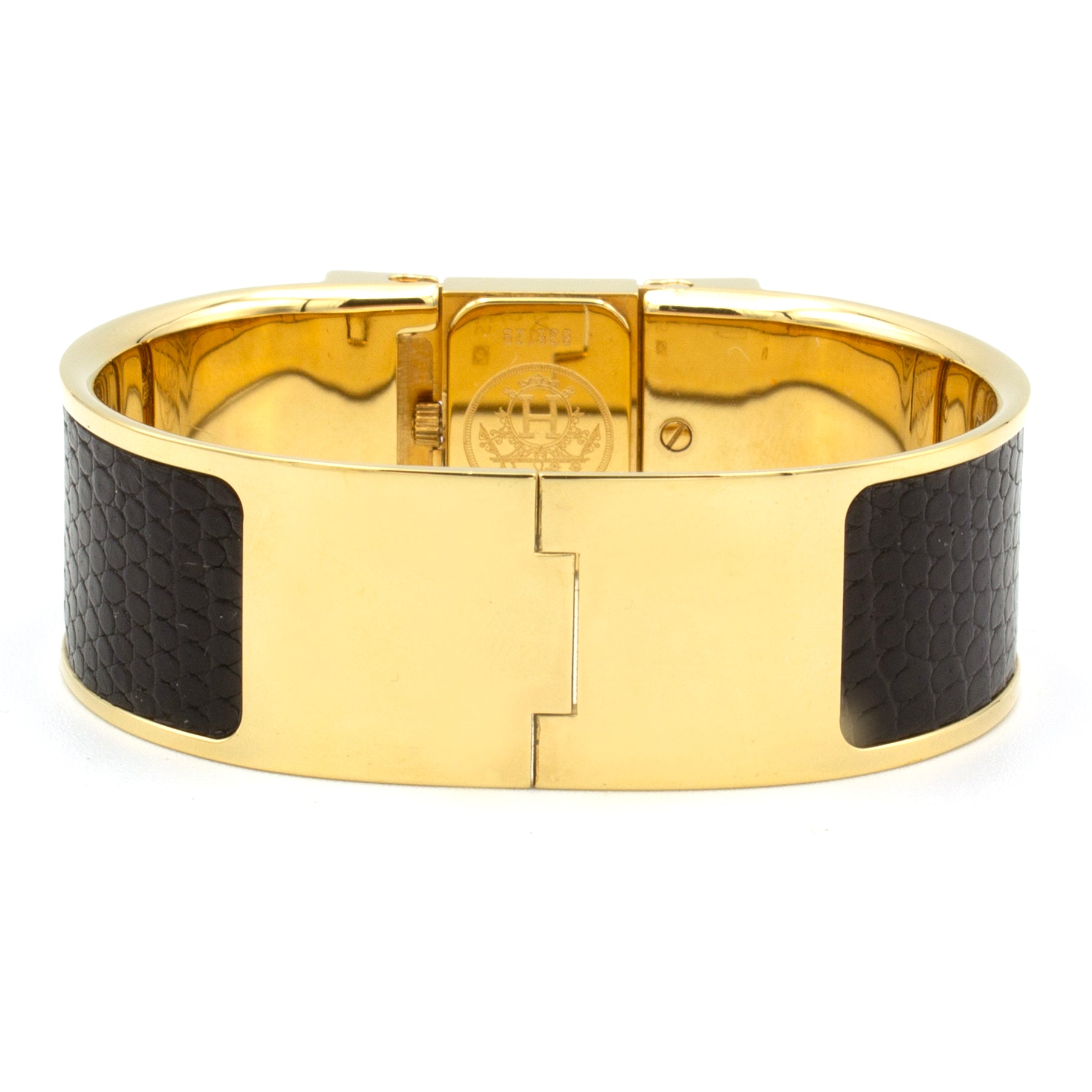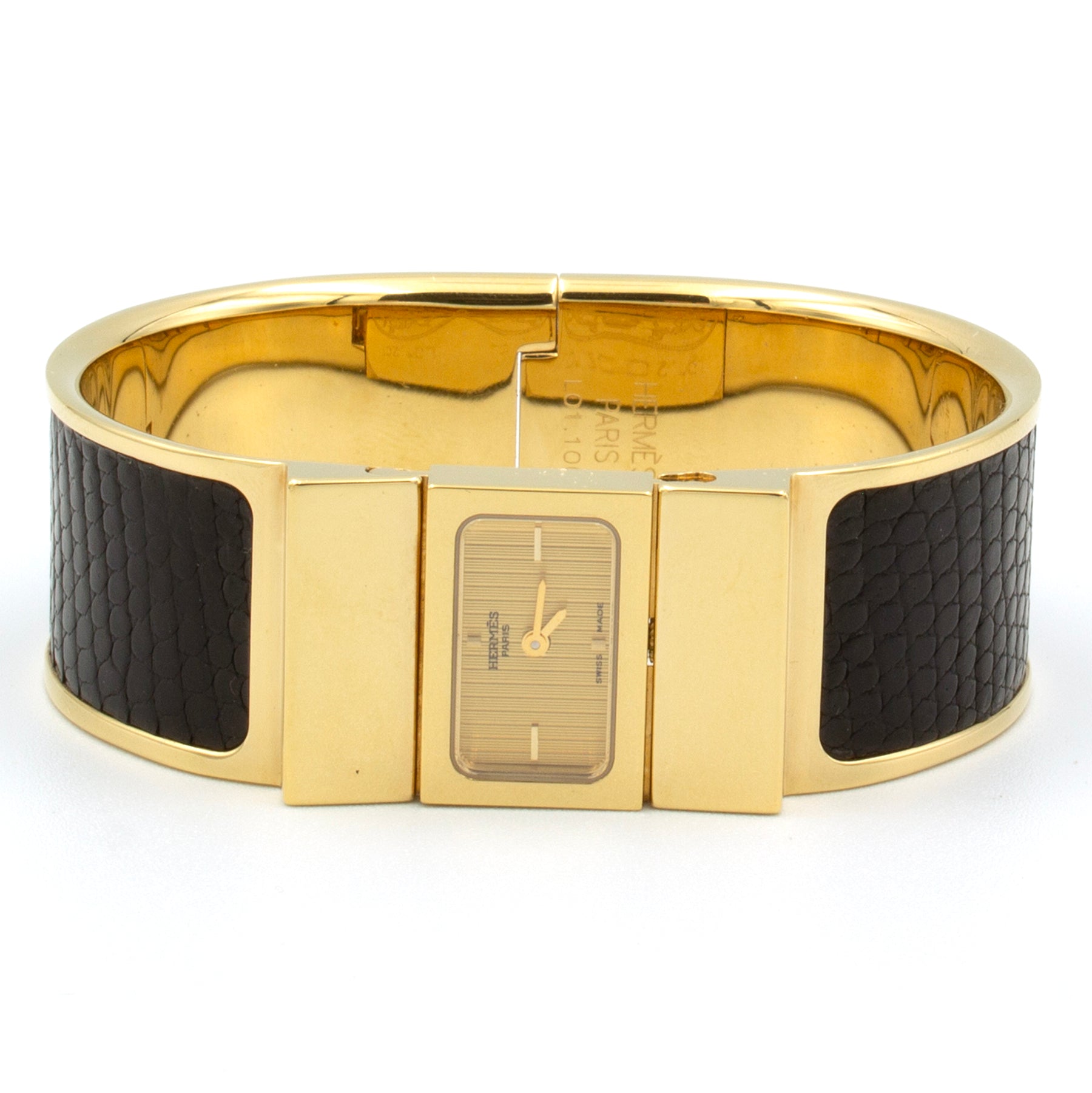 Beautiful Hermès Loquet watch, model LO1.210 for women. The watch has been fully serviced in our workshop and comes with a one-year seller's warranty from the date of purchase. Directly inspired by the clic-clac bracelet, the case is housed within the clasp mechanism. Hermès gold-plated bracelet covered in black lizard leather. 13 x 19 mm steel case. Gold dial. Swiss-made quartz movement. In good overall condition, with normal signs of wear for a second-hand item. See photos for details. Signed and numbered.