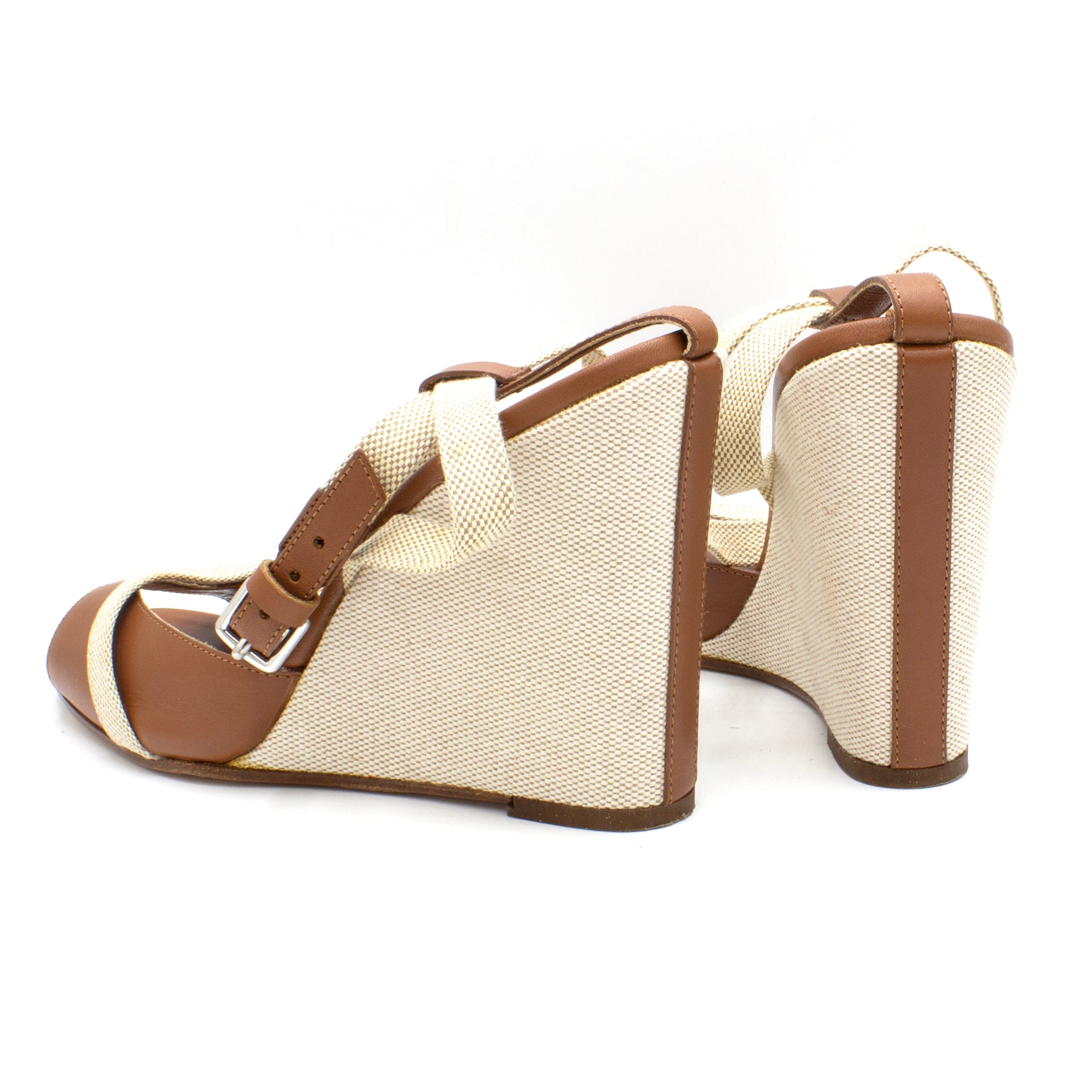 Superbes sandales Hermès compensées en cuir barenia et toile écrue.