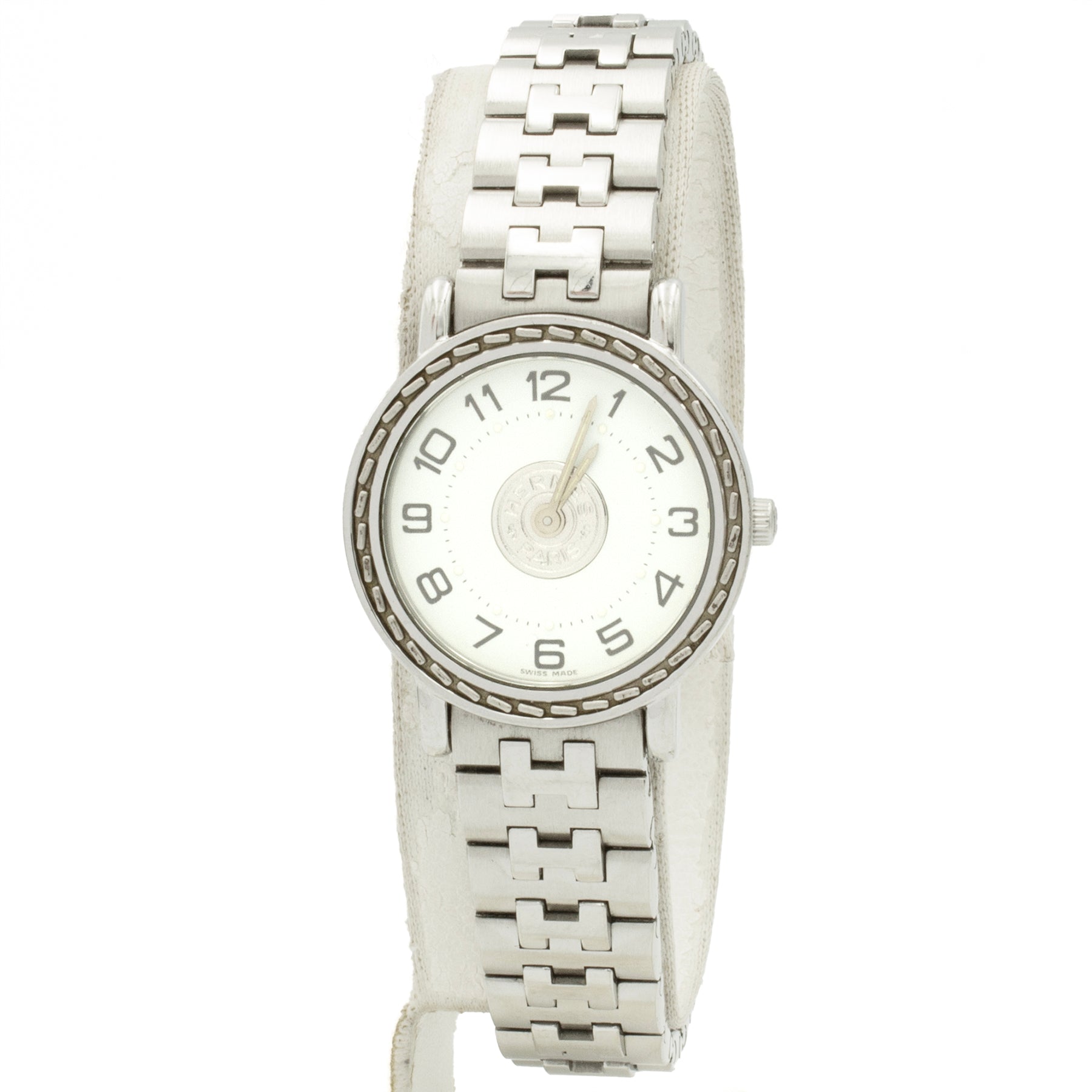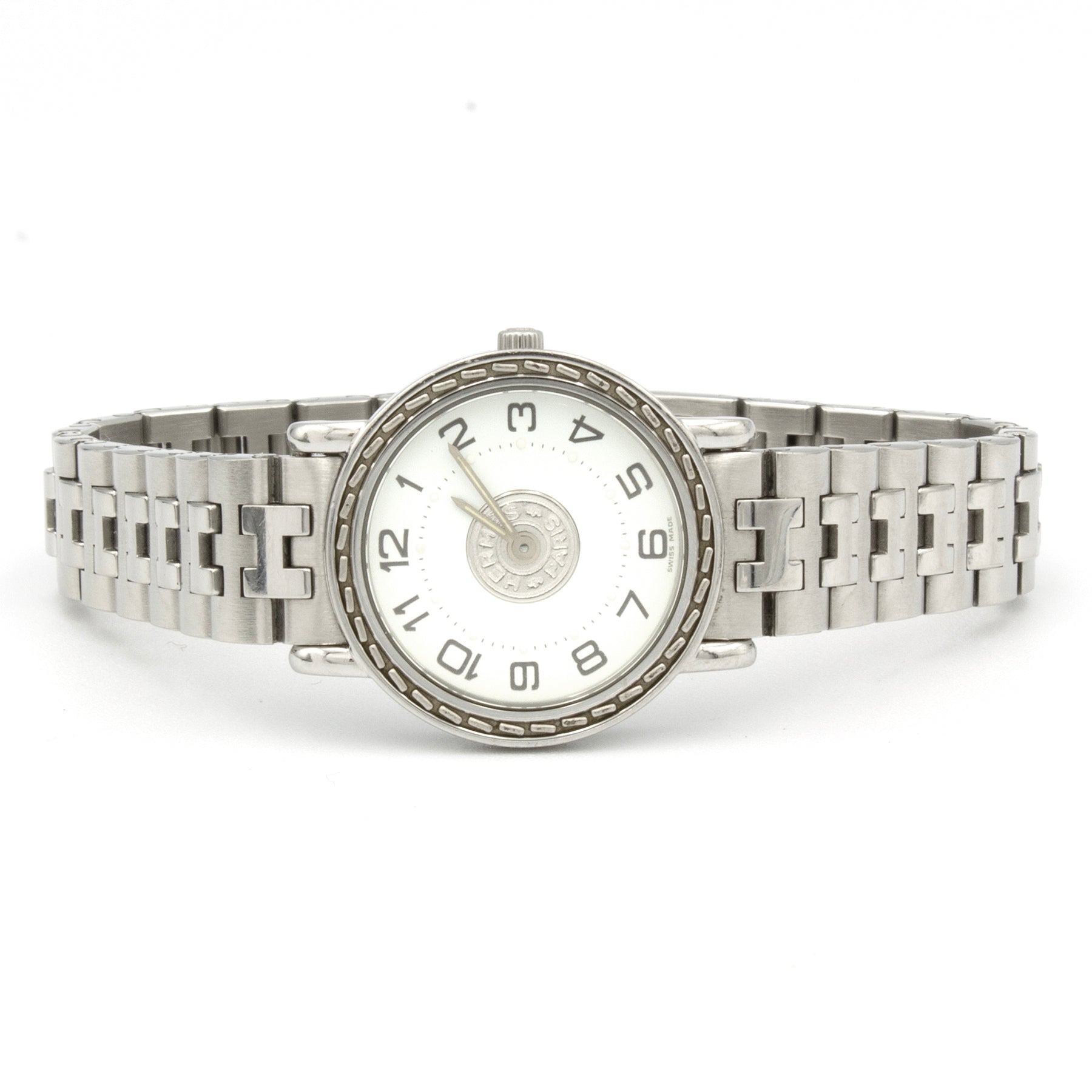 - White dial decorated in the center with a silvered Hermès saddle stud.