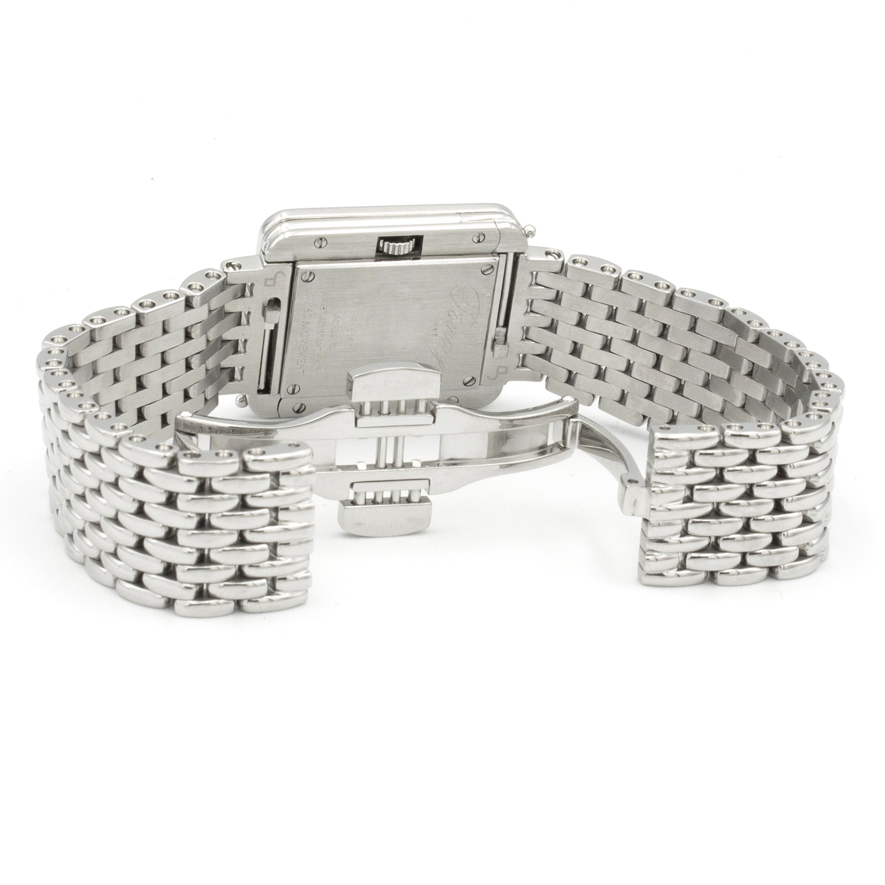 - Mother-of-pearl dial without numerals, silver hands, 4 diamond hour markers.
